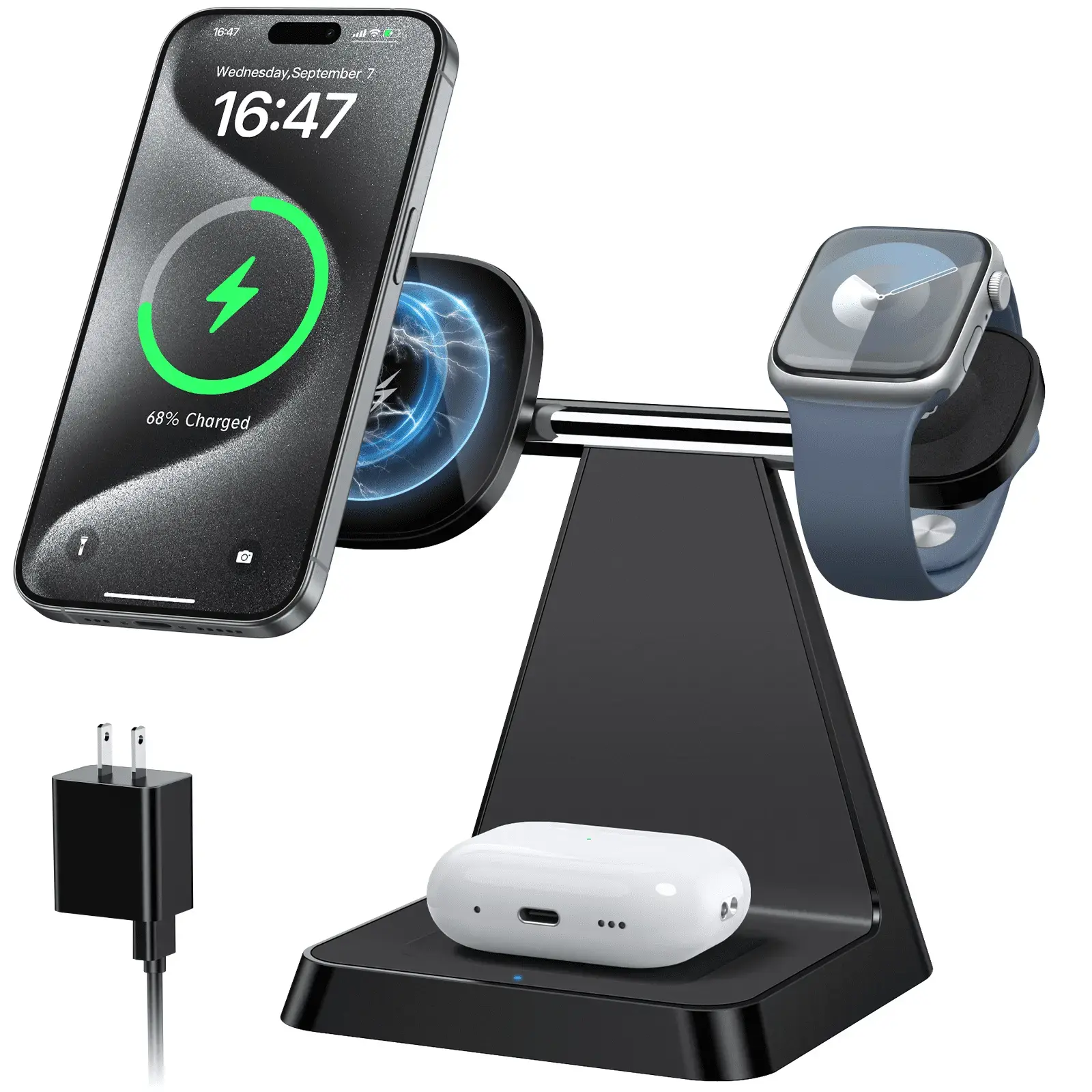 • Upgraded Mag-Safe Charger: A 3-in-1 charging station that eliminates tangled cables, compatible with iPhone 12-16 Series, Apple Watch, and AirPods Pro/3/2 for simultaneous charging.