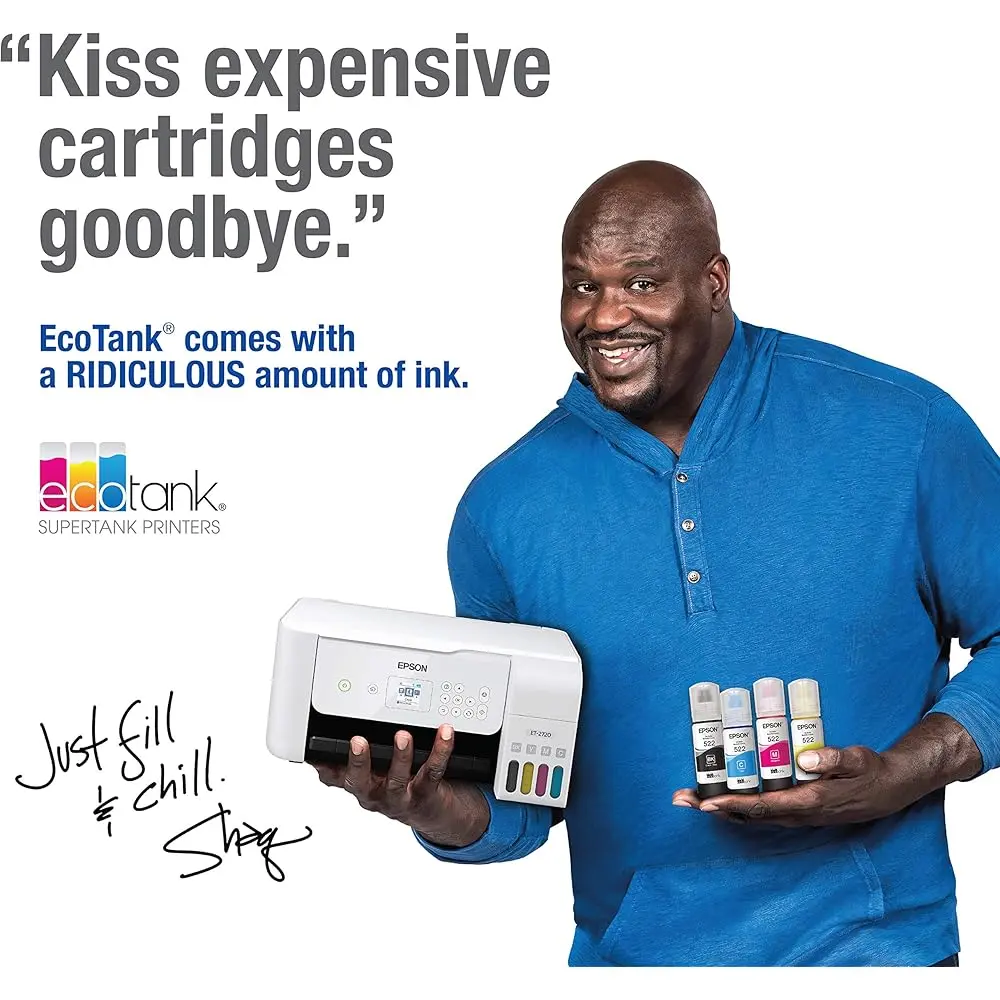 The EcoTank ET-2720 is a wireless all-in-one supertank printer that offers cartridge-free printing with easy-to-fill, large ink tanks. Each included or replacement ink set provides up to 2 years of ink, and each bottle set can print up to 4,500 pages, which is equivalent to about 80 individual cartridges. Save up to 90% on ink costs with low-cost replacement ink bottles, reducing waste. The printer uses exclusive EcoFit bottles for easy, mess-free filling of each color tank. With wireless printing from smartphones and tablets, the ET-2720 offers convenience