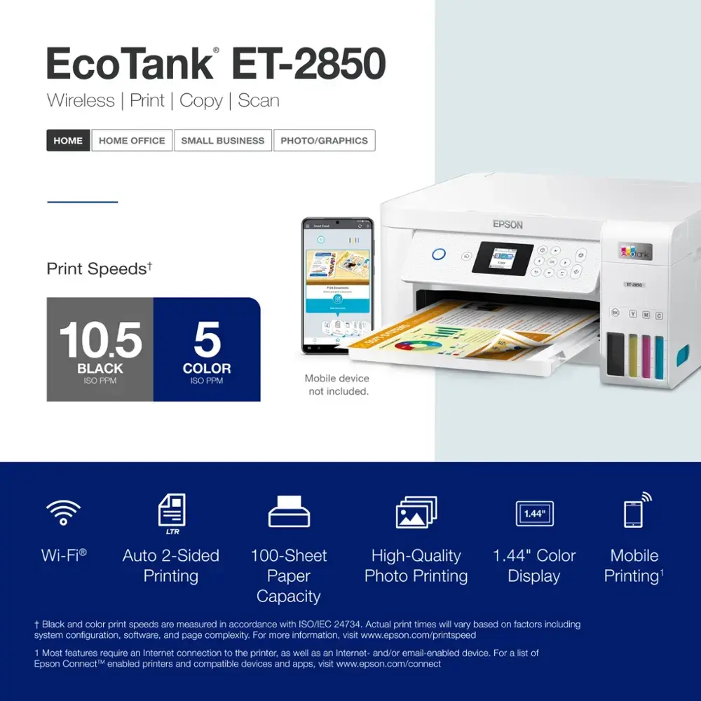 The Epson EcoTank ET-2850 is a cartridge-free, high-capacity ink tank printer designed for affordability, convenience, and efficiency. It features auto-duplex printing, a high-resolution flatbed scanner, and a color display, making it a perfect choice for home and family use. With Epson's EcoFit ink bottles, refilling is easy and worry-free, while Micro Piezo Heat-Free technology ensures sharp text and vibrant color prints on various paper types.