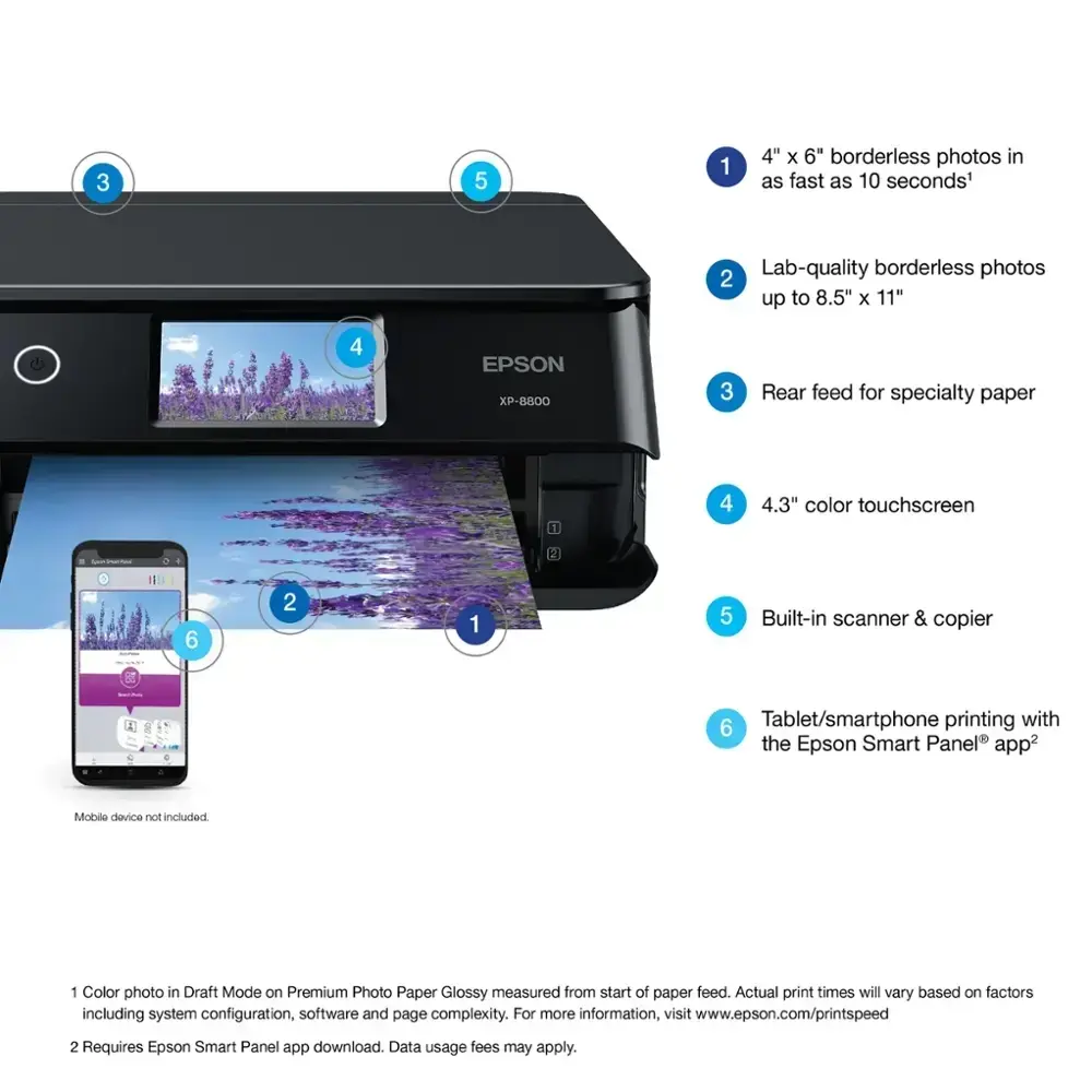 Unleash your creativity with the Expression Photo XP-8800. Ideal for printing family photos, greeting cards, art projects, and more, this all-in-one printer uses advanced 6-color Claria Photo HD ink to deliver professional-quality borderless prints up to 8.5" x 11". It’s incredibly fast too, printing sharp, detailed 4" x 6" photos in as little as 10 seconds¹. Compact and user-friendly, the XP-8800 fits in almost any space and features a large 4.3" color touchscreen for easy navigation. With Easy Mode, you can personalize the control panel for quick access to your most-used functions. Additionally, built-in wireless connectivity and compatibility with the Epson Smart Panel app² allow seamless printing from your laptop or mobile device.