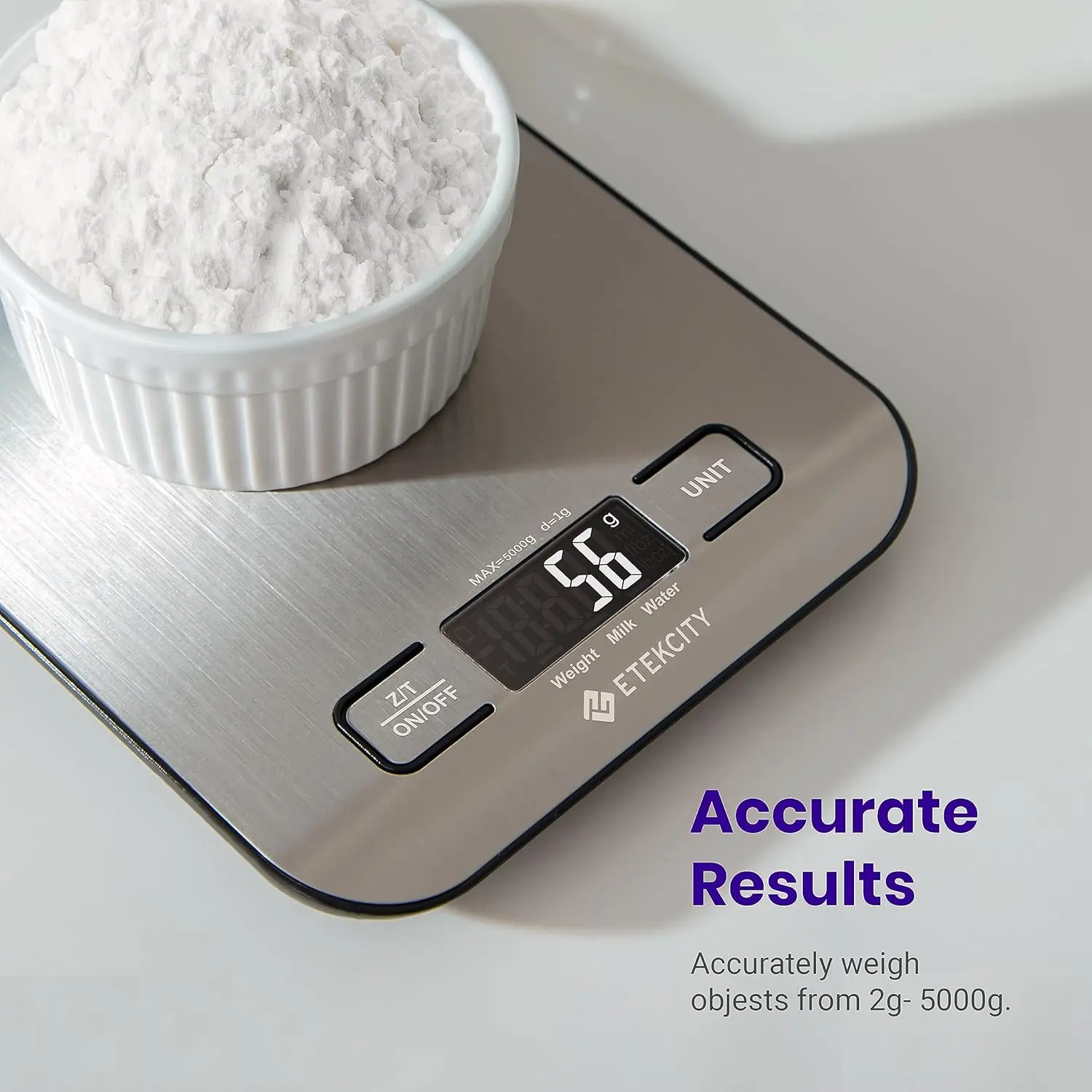 Effortless Weighing: Supports 5 units (oz/lb/fl'oz/g/mL), includes tare function and 2 AAA batteries for easy use.Precise Results: Weighs up to 5 kg/11 lb with 1 g increments.Simple & Compact: Sleek design fits most kitchens and stores easily.Easy to Clean: Wipe down 304 food-grade stainless steel surfaces.LCD Display: Backlit screen with large fonts for easy reading.
