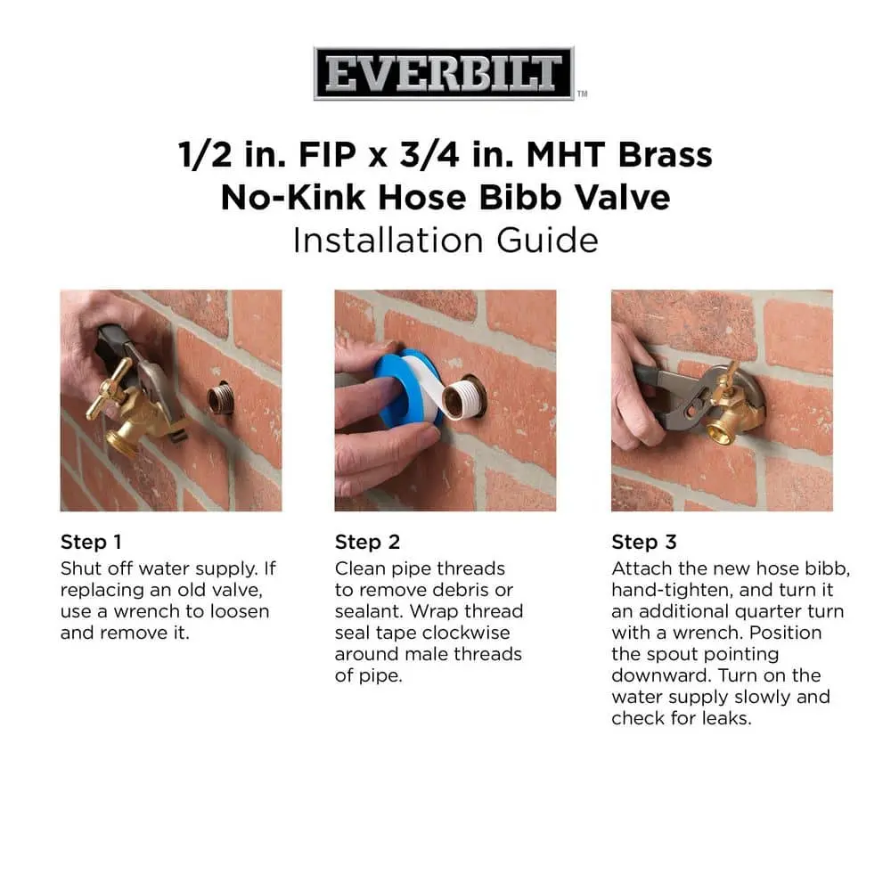 Ideal for both residential and commercial use, the Everbilt No-Kink Hose Bibb is specially designed for milder climates. This heavy-duty valve, crafted from durable brass, features a multi-turn handle for easy operation. The 3/4 in. male threaded hose outlet is compatible with most standard 3/4 in. garden hoses, and the angled hose outlet helps prevent kinking during use.