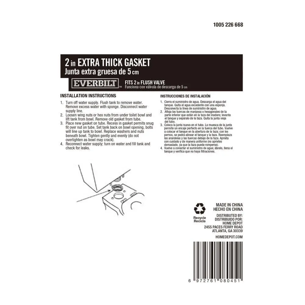 Replace your old bowl gaskets with this universal 2 in. rubber gasket. Designed with a thick, beveled 2 in. structure for added strength and durability, this gasket securely keeps the tank attached to the bowl, preventing leaks. It is compatible with most 2 in. standard toilets.