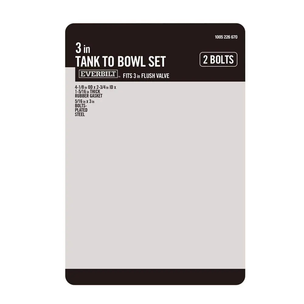 This 3 in. Tank-to-Bowl Kit helps prevent leaks between your toilet tank and bowl. The 15-piece kit includes 2 zinc-plated galvanized steel bolts, a 3 in. rubber gasket, and washers. By stopping leaks, it helps save water, energy, and money.