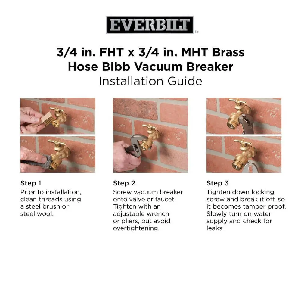 Protect your drinking water from contamination with the Everbilt 3/4 in. Hose Connection Vacuum Breaker. Made from durable brass, this reliable device is designed to prevent back siphoning into the potable water supply. It features threads that fit most standard hose end valves and garden hoses. The breaker includes a neoprene seat disc, rubber washer, and steel set screw for secure installation. A protruding tip allows for manual drainage to help prevent freezing. For a permanent installation, the optional set screw can be tightened and broken off.