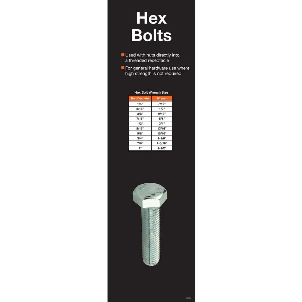 Hex bolts feature a hexagonal head and machine threads, making them ideal for machinery and construction applications, both residential and commercial. Fully threaded bolts offer strong grip, while partially threaded bolts are suited for areas where shear resistance is essential. Secure with a compatible nut or use in a tapped (threaded) hole.