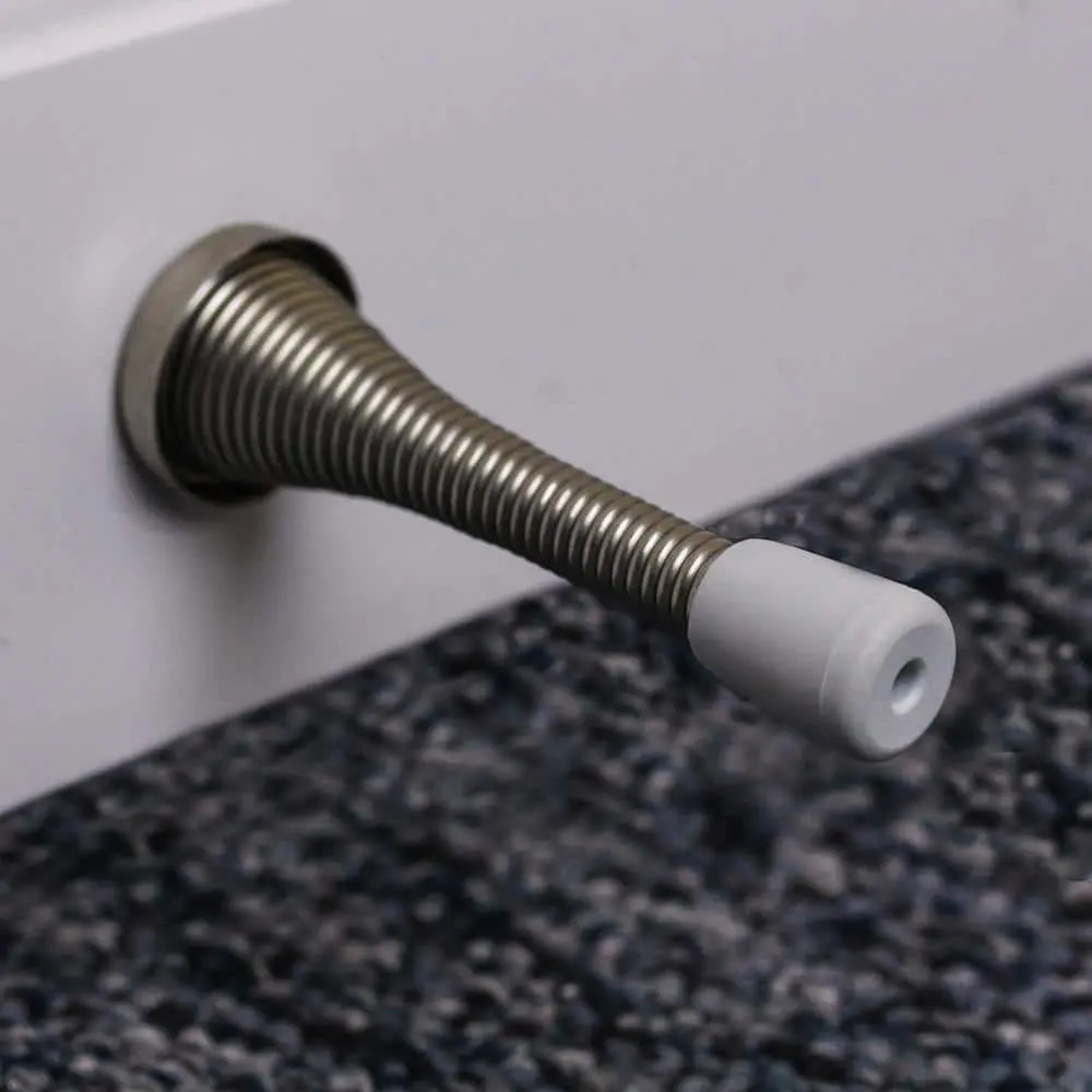 The Everbilt 4 in. Satin Nickel Spring Doorstop is designed to prevent wall damage when opening doors. Its rubber bumper tip helps safeguard the door, while the spring design offers flexibility for door movement.