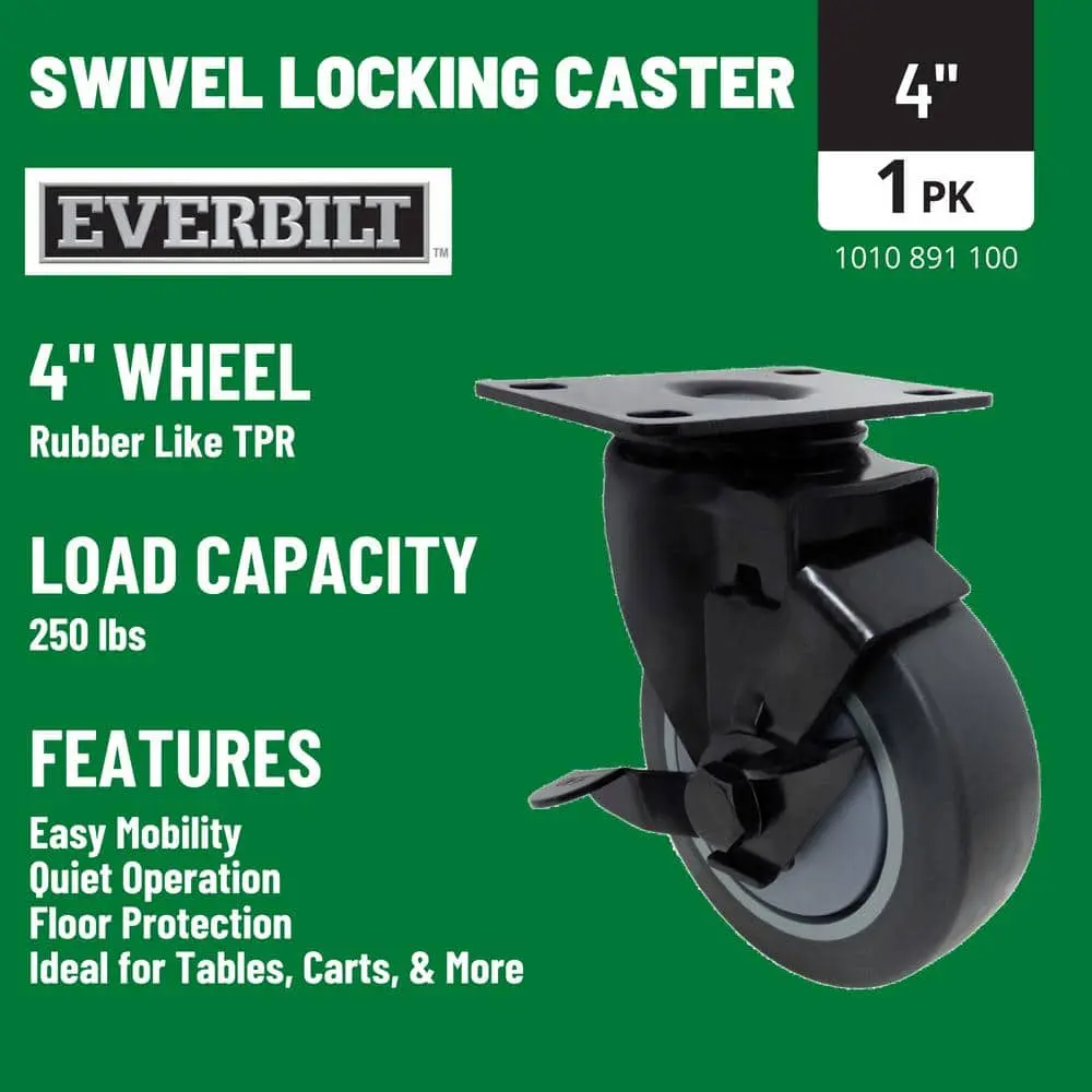 The 4 in. swivel caster with brake and non-marking rubber is designed for both everyday residential use and applications in labs, hospitals, food service, and other institutional settings. The durable yet soft rubber offers a smooth ride while withstanding exposure to chemicals, solvents, and more. Each caster has a 250 lb. load rating.