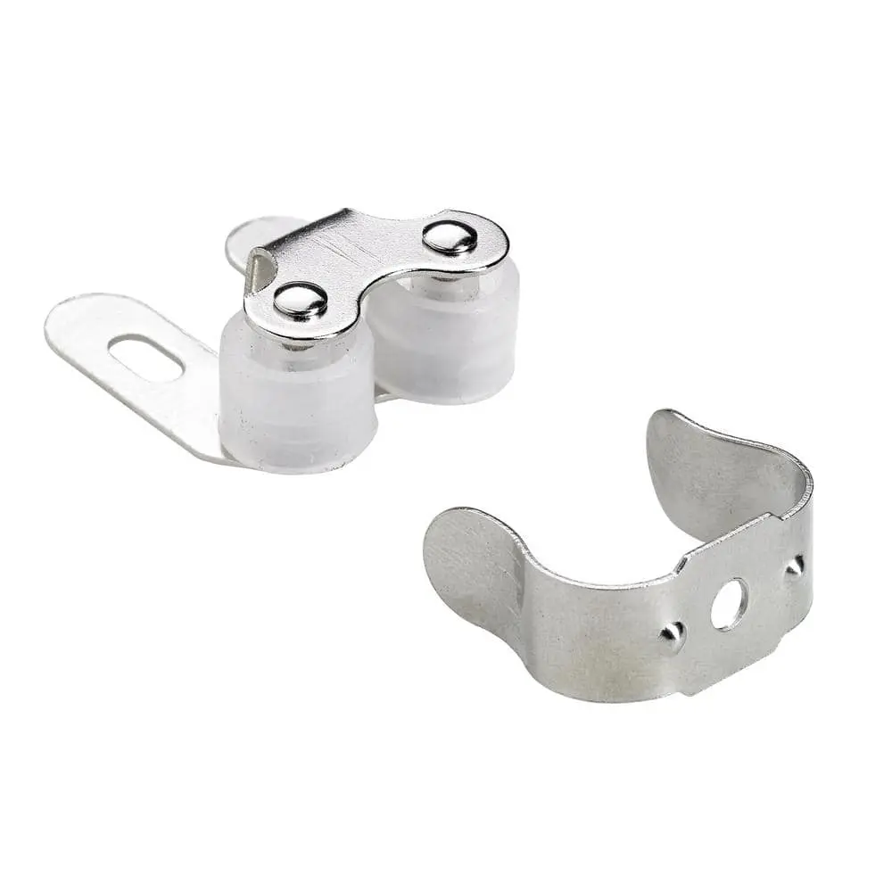 This nickel-plated latch with a C-clip catch is ideal for furniture and vanity doors. Featuring two nylon rollers, it quietly catches the door, preventing noisy banging. Installation is simple with the included screws for easy screw-on mounting.