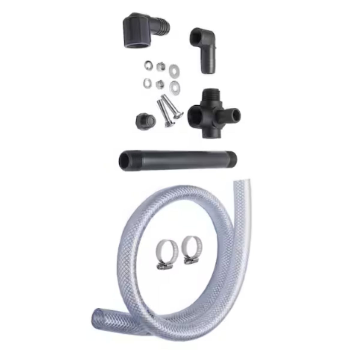 This tank hookup kit comprises various fittings and a hose designed to facilitate the connection between a jet pump and a vertical or horizontal well tank, accommodating tanks of up to 44 gallons (mounting bracket sold separately). Included in the kit are 2 elbows, a 1 inch discharge tee, a 1 inch hose, and a 1 inch x 10 inch Sch. 80 PVC nipple, along with clamps, nuts, and bolts for mounting. The distinctive 1 inch tee screws into the discharge of most jet pumps and features a 1/2 inch port for convenient priming after installation.
