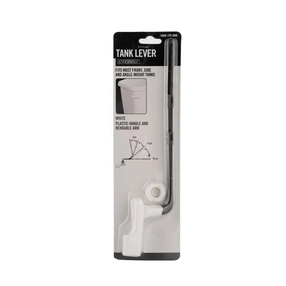 This toilet tank lever is designed to fit most front-mount toilets, offering a simple and stylish way to remodel your bathroom. It’s easy to install and includes a white plastic handle, plastic arm, and white spud and nut.