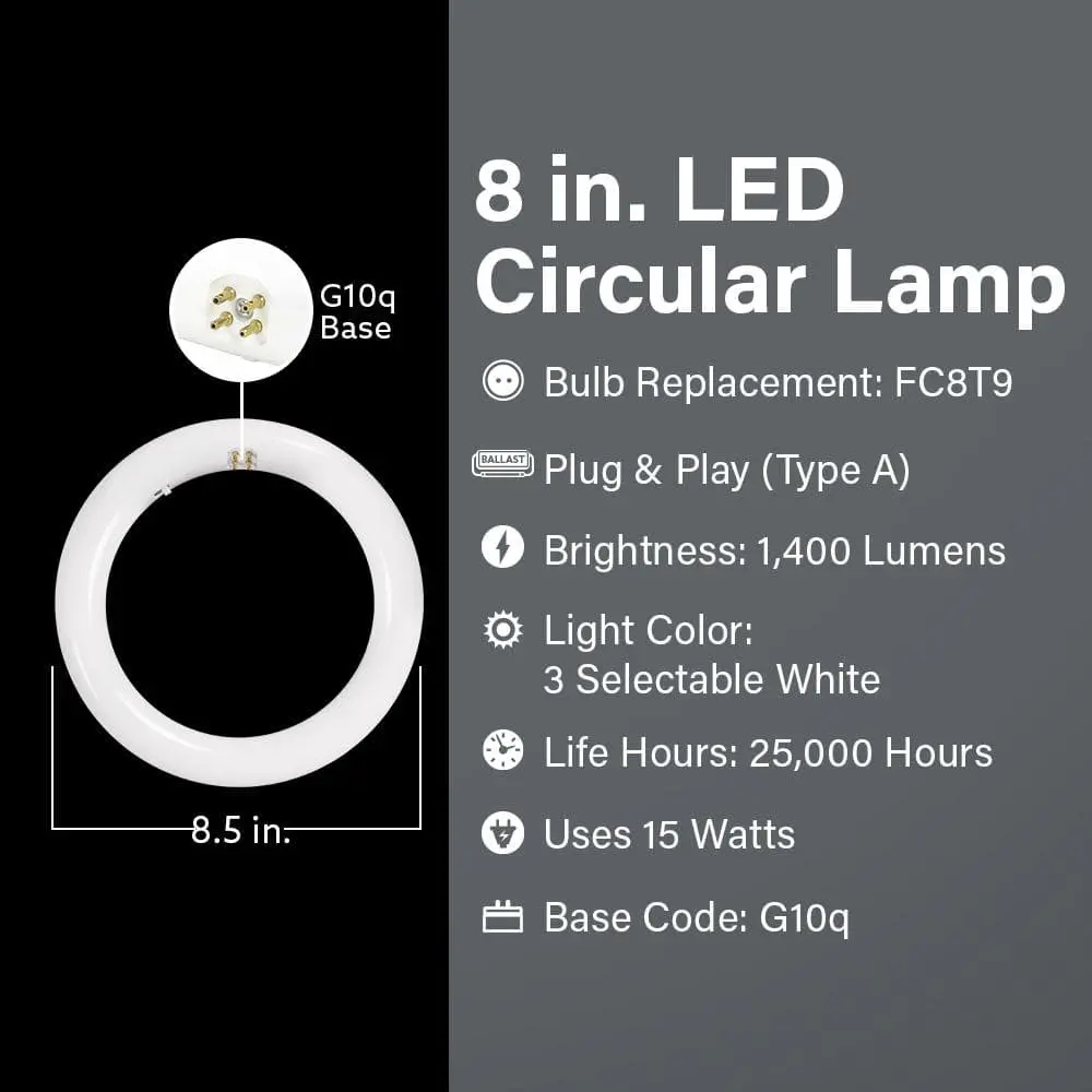 Upgrade your fluorescent fixtures with the Feit Electric 15W (22W Equivalent) 8-Inch Circline LED Light, designed to deliver energy-efficient, high-quality illumination. This non-dimmable LED tube provides 1400 lumens of brightness and serves as a direct replacement for FC8T9 or T9 fluorescent bulbs—ideal for ceiling fans and other fixture applications. Choose from 3500K Neutral White, 4000K Cool White, or 6500K Daylight before installation to achieve the perfect lighting for any setting.