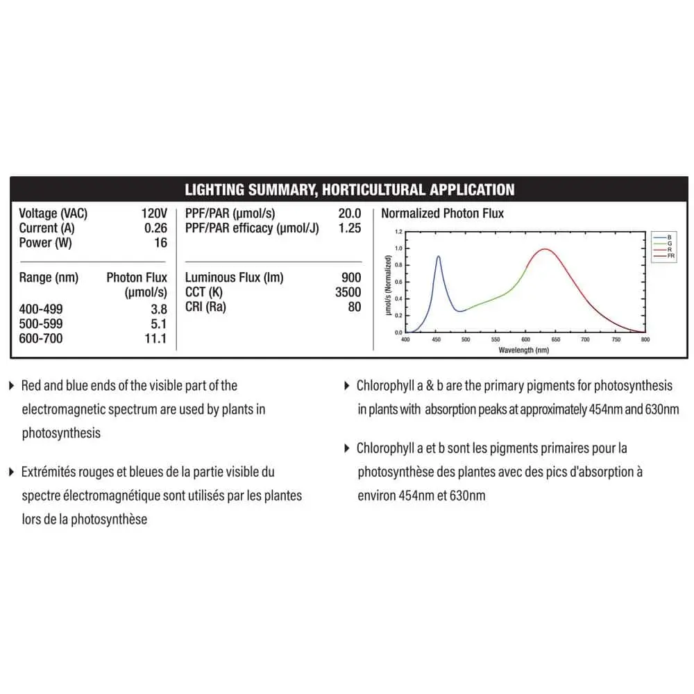 With a PAR/PPF value of 20.0, this energy-efficient LED grow light provides 900 lumens of brightness at an estimated annual energy cost of just $1.93. Built to last, it offers up to 25,000 hours of use (approximately 22.8 years at 3 hours per day), reducing maintenance and replacement costs. The 40° beam angle makes it ideal for table lamps, pendant fixtures, or other open fixtures with E26 sockets. Designed for high-humidity environments, it is suitable for indoor gardening, hydroponics, and organic growing. This UL/CUL listed and FCC-compliant grow light allows you to enjoy pesticide-free fruits and vegetables year-round.