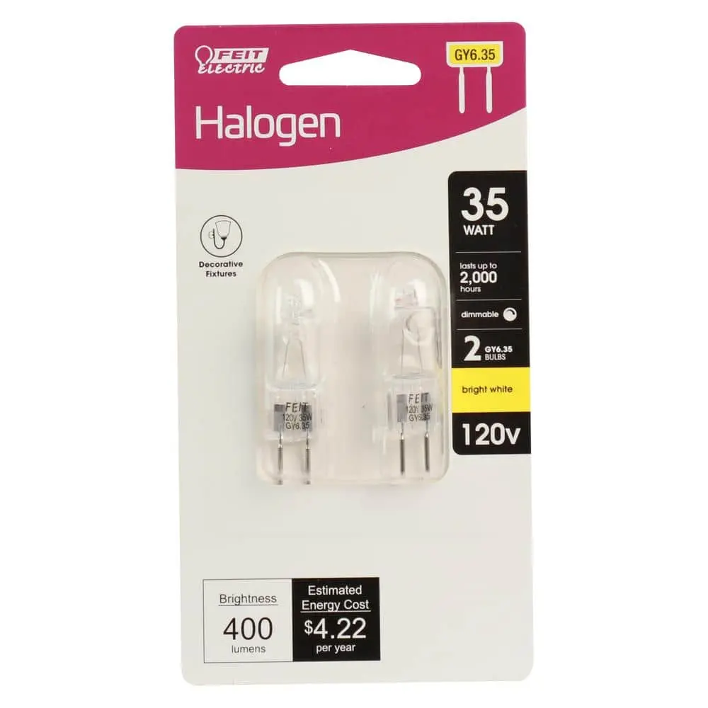 Enjoy reliable, energy-efficient lighting with the Feit Electric 35-Watt T4 Bright White Halogen Light bulb. The BPQ35T4/JCD/2/HDRP bulb offers a 2700K bright white glow while using just 35 watts of energy. It is fully dimmable and features a GY6.35 base, providing up to 2,000 hours of use.