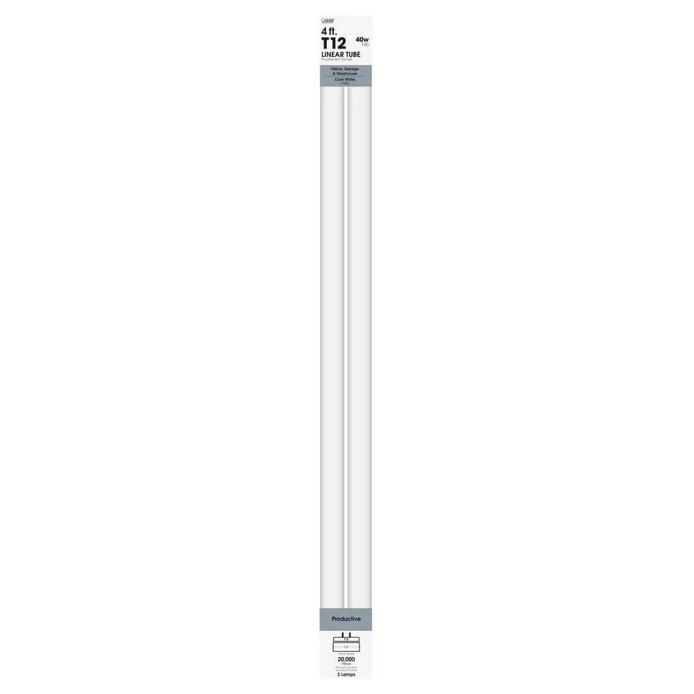 Feit Electric's 40-watt Cool White Non-Dimmable Fluorescent Linear Tubes are designed to replace T12 fluorescent tubes. These 2600-lumen lights emit a 4100K Cool White light, providing clean and neutral white illumination for both residential and commercial spaces. Perfect for multi-purpose or task lighting, they are ideal for offices, garages, workspaces, warehouses, and more. Upgrade from older, lumen-depreciated bulbs to these newer fluorescent lights to maintain optimal brightness. The F40CWX/2 tubes have an estimated energy cost of just $4.82 per year. Enjoy up to 20,000 hours of reliable light, which lasts approximately 18.3 years with 3 hours of daily use.