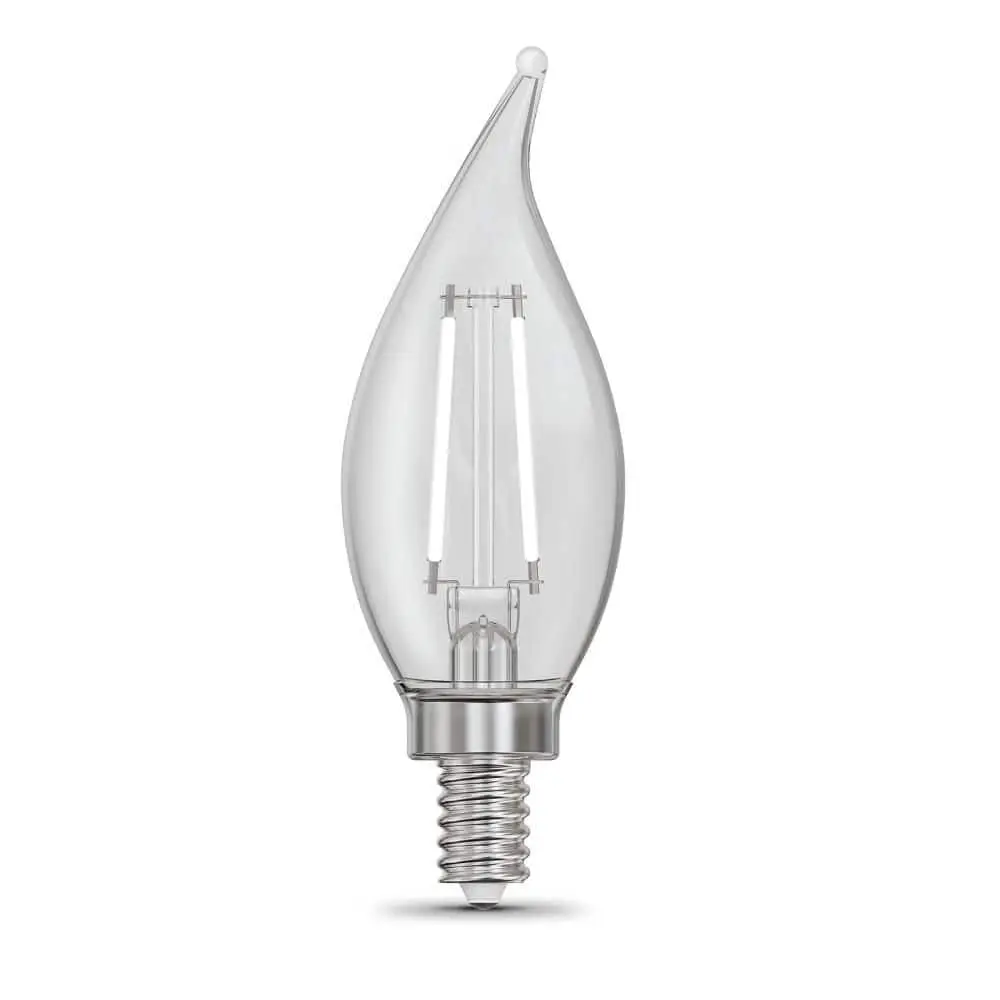Transform your lighting with Feit Electric's stylish Exposed White Filament Flame BA10 LED Bulbs, offering a modern twist on traditional decorative bulbs. These innovative white filament bulbs combine a classic flame tip design with sleek, lower-profile white filaments inside clear glass. Unlike yellow filaments, the white filaments seamlessly blend into your decor, providing a timeless look that complements any room. The dimmable 2700K Soft White glow creates a relaxing and inviting atmosphere, free of harsh glare. Ideal for any fixture with a Candelabra E12 base, such as chandeliers, wall sconces, and coach lanterns, these bulbs emit 300 lumens of light while consuming just 3.3 watts, delivering up to 91.8% energy savings compared to standard 40-watt incandescent bulbs. A 90+ CRI ensures more vibrant and natural colors. With a lifespan of up to 15,000 hours and an estimated energy cost of only $0.40 per year, these bulbs are a great way to enhance both home and commercial spaces.