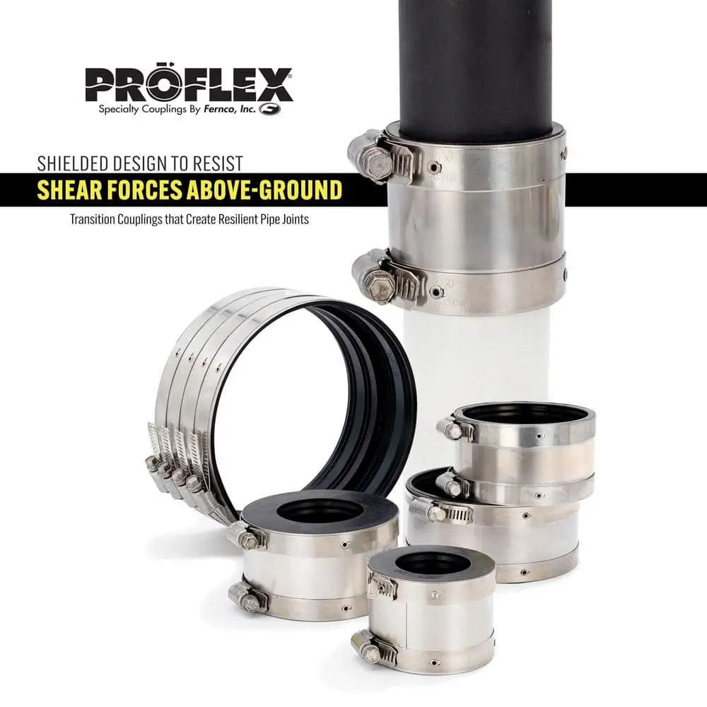 Fernco Proflex Couplings are designed for above-ground use, providing durable pipe joints. With a shielded design, they effectively resist shear forces above ground. Available in sizes ranging from 1-1/2 in. to 8 in., these couplings connect cast iron, plastic, steel, copper, and tubular drain, waste, and vent systems.