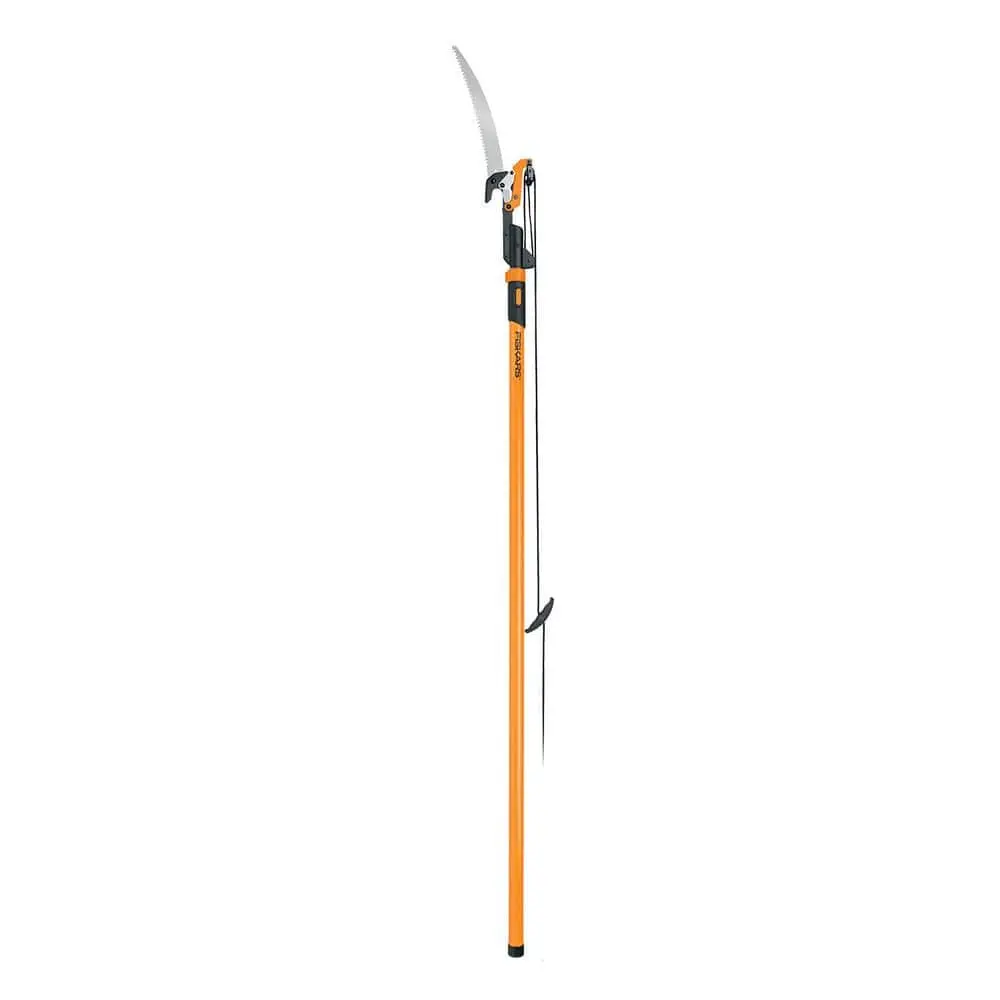The Power-Lever Extendable Pole Saw and Pruner allows you to easily reach high branches with its extendable design, reaching up to 14 ft. It offers two cutting options, with unique Power-Lever technology that increases leverage for added cutting power. The lightweight, oval-shaped poles reduce flex, provide better cut control, and fit naturally in your hand. A double locking system ensures the pole remains securely extended. The sharp steel pruner cuts branches up to 1-1/8 inches thick, featuring a low-friction coating for smooth cuts, reduced gumming, and improved rust resistance. For thicker branches, the 15-inch WoodZig saw delivers added cutting strength.