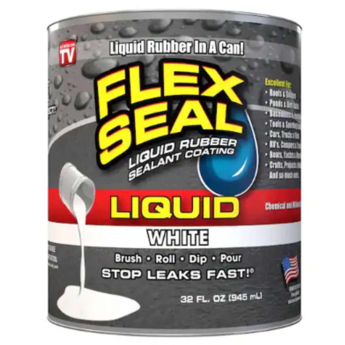Introducing Flex Seal Liquid, a versatile liquid rubber coating that provides a convenient solution in a can. Similar to our popular Flex Seal Spray, it offers multiple application methods—brushing, rolling, dipping, or pouring—for creating a strong, flexible, and waterproof seal. This innovative formulation starts as a thick liquid and transforms into a durable, breathable, weatherproof barrier that resists rain, snow, sun, wind, and extreme temperatures. It effectively seals out air, water, and moisture, preventing rust, corrosion, and mold growth. Non-hazardous and non-flammable, it's safe for use around plants and animals. Trusted by professionals and DIY enthusiasts, Flex Seal Liquid works on various surfaces like copper, tile, aluminum, and foam, as well as with materials such as EIFS, TPO, PVC, EPDM, CSPE, Hypalon, and polyurethanes. Online pricing includes a PaintCare fee in specified states, ensuring both effectiveness and environmental responsibility in one reliable product.