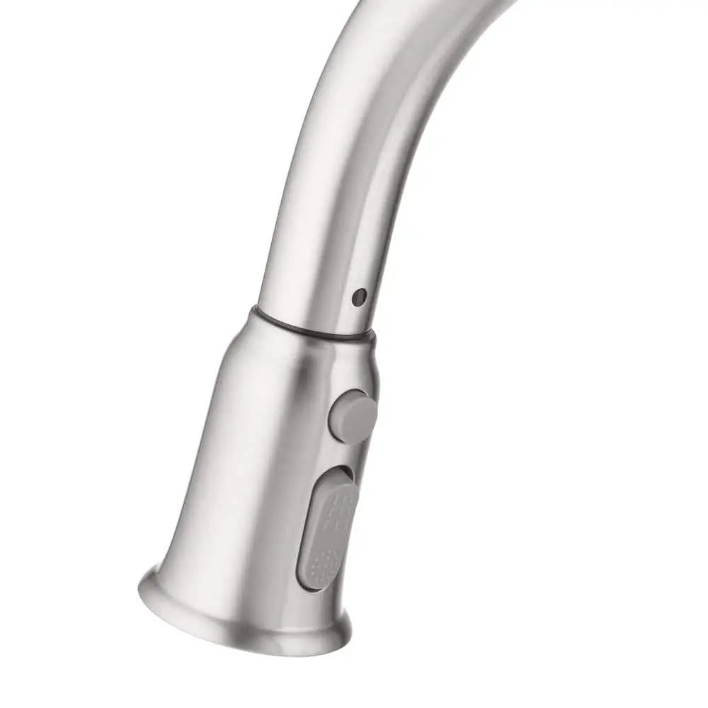 The Glacier Bay Kagan single-handle kitchen faucet features a high arc design, 360-degree swiveling spout, and retractable pull-down sprayer, making it easy to fill large pots and clean dishes. It includes a dual-function spray head with stream and spray settings and a 1.8 GPM flow rate. The faucet comes with a matching soap dispenser and an optional deckplate for compatibility with single, 2, 3, or 4 hole sinks. A durable ceramic disc valve ensures drip-free performance, and FastMount hardware simplifies installation. Built-in 30-inch supply lines are clearly marked for hot and cold water, with recommended installation tools not included.