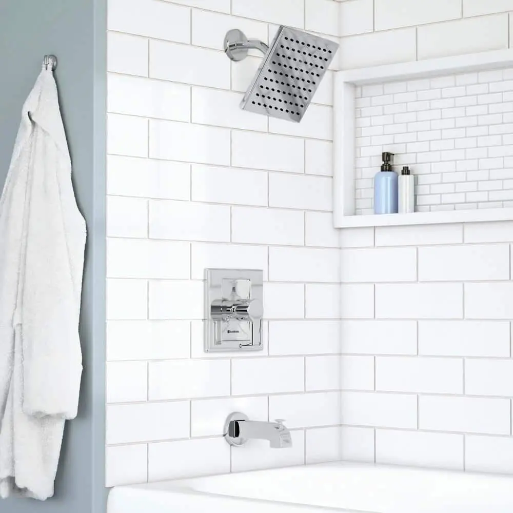 The Glacier Bay Modern Single-Handle Tub and Shower Faucet in Chrome, where sleek, contemporary design meets affordability. Enjoy the reliability of a ceramic disc valve for smooth operation and long-lasting durability. The spacious 8-inch wide spray face of the showerhead enhances your showering experience with increased spray force and a wider coverage area. With a built-in pressure balancing system, you can indulge in a consistently comfortable shower every time. Upgrade your space today with Glacier Bay.