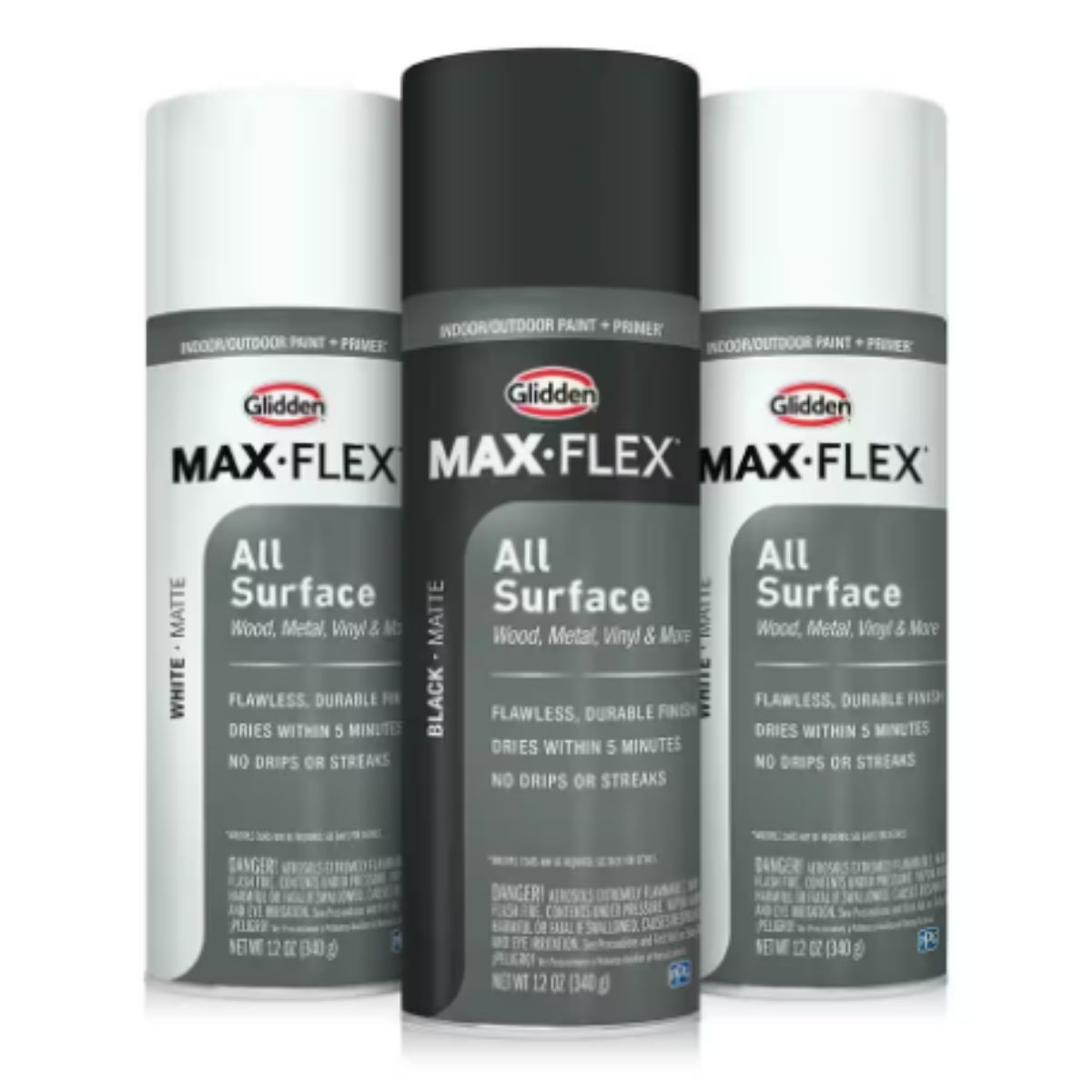Introducing GLIDDEN MAX FLEX matte black spray paint, a revolutionary all-surface interior/exterior paint and primer that delivers exceptional coverage with its advanced technology. Designed to provide an ultra-durable finish on a wide range of surfaces including wood, metal, plastic, and glass, this product features a unique spray pattern for a smoother, broader coverage compared to traditional sprays. It dries within just 5 minutes, minimizing downtime between coats, and ensures a flawless, long-lasting finish that instills confidence for any project. Perfect for achieving a deep, dark matte black color, GLIDDEN MAX FLEX spray paint offers drip-free, streak-free application and allows for unlimited recoats, making it an ideal choice for both professional and DIY enthusiasts alike.