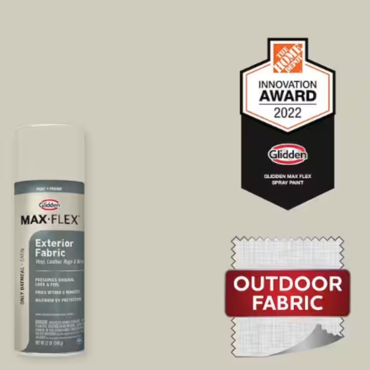 Introducing GLIDDEN MAX FLEX Exterior Fabric, an advanced paint and primer spray designed for exterior fabrics such as vinyl, leather, and rugs. This product features revolutionary UV protection technology while maintaining the original look and feel of your items. Its unique spray pattern delivers a smoother, broader finish with fewer passes compared to traditional sprays. GLIDDEN MAX FLEX dries within 5 minutes, ensuring a flawless, durable coat without drips or streaks. You can apply multiple coats without limitations for optimal coverage. "Only Oatmeal" is a soft, white tea green color with a green undertone, complementing projects well alongside plum tones.