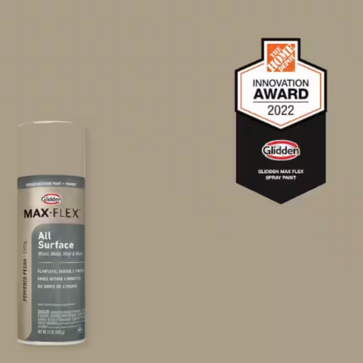 GLIDDEN MAX FLEX All Surface is an interior/exterior paint and primer spray paint featuring revolutionary technology that delivers exceptional coverage and an ultra-durable finish across a broad spectrum of surfaces including wood, metal, plastic, and glass. Its unique spray pattern ensures a broader, smoother application, covering surfaces more effectively with fewer passes than traditional conical spray patterns. Drying in just 5 minutes, it boasts a flawless, durable finish that instills confidence in your projects. Key highlights include its innovative spray paint technology for excellent coverage, rapid drying time for quicker recoating, drip-free and streak-free application, a specialized formula for a professional factory finish, and its versatile warm tan color with red undertones, perfectly complementing a variety of decorative styles and accents.