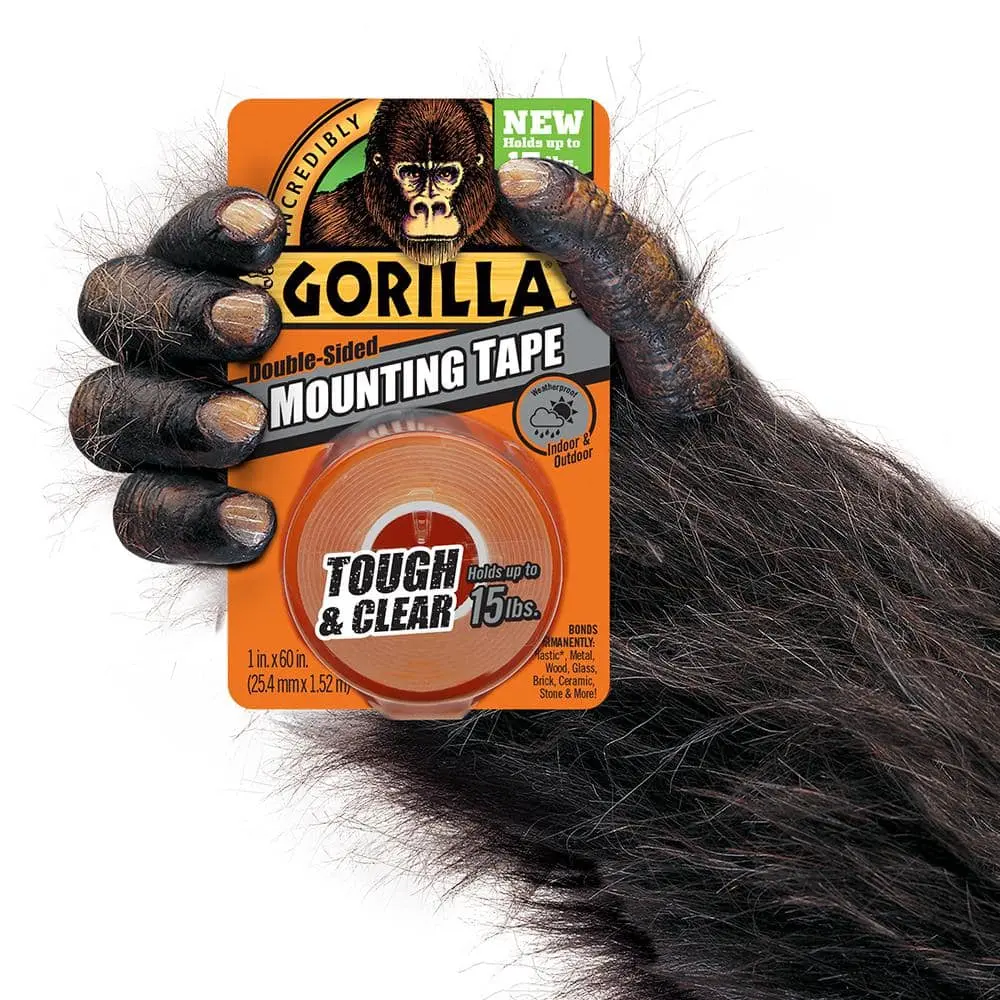 he Gorilla 1 in. x 1.67 yds. Tough and Clear Mounting Anti-Slip Double Sided Tape offers strong adhesion for a secure, long-lasting bond. Its anti-slip feature ensures that objects stay in place without sliding or shifting. The clear design makes it perfect for discreet mounting applications, while the 1 in. x 1.67 yds. size provides a compact roll for easy use in smaller spaces. This versatile tape is ideal for mounting, securing, and organizing various items around your home or workspace