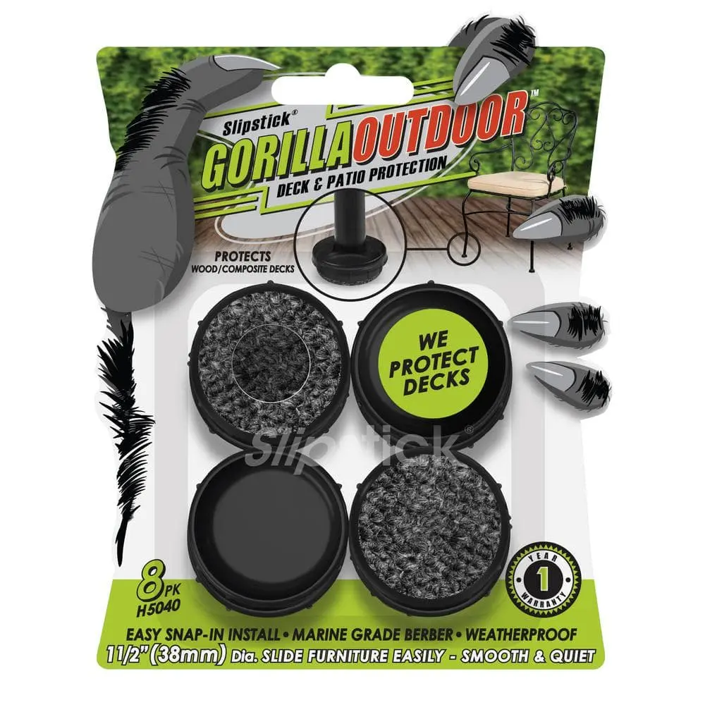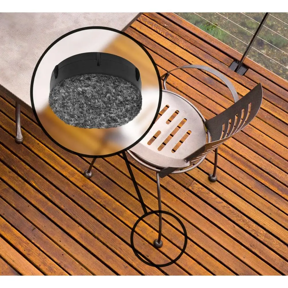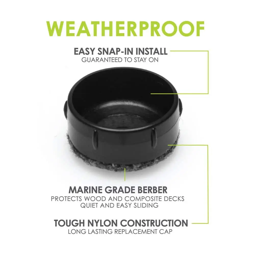 The GorillaOutdoor Wrought Iron Berber feet are high-quality replacement caps for your outdoor patio furniture. Made with marine-grade berber, they provide a quiet, scratch-resistant, and weatherproof surface to protect the bottom of your furniture. These caps also prevent rust marks and damage caused by missing or damaged feet. They are compatible with most outdoor surfaces, including concrete, wood, and composite, and fit 1-1/2 inch inside diameter cups. Installation is simple with a rubber hammer or mallet. For best results, remove any dirt, debris, or rust, and touch up exposed metal before installation.