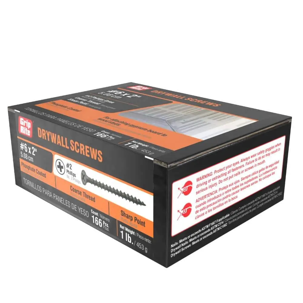 The Grip-Rite2CDWS1 #6 x 2 in. #2 Phillips Bugle Head Coarse Thread Sharp Point Drywall Screws are ideal for interior drywall applications. Coated with black phosphate to resist corrosion and enhance mud adhesion, these screws are perfect for securing gypsum drywall to wood studs. Known for their durability and reliability, they are a must-have in the construction industry.