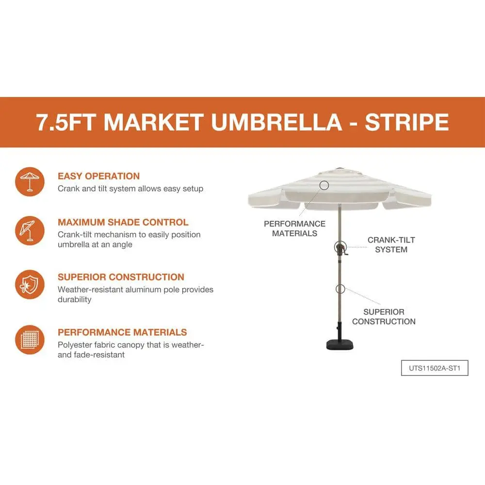 Create a cozy, welcoming space in your garden with this Hampton Bay outdoor patio umbrella. Featuring a sturdy aluminum support pole and steel ribs, it offers reliable stability and support. The crank and auto-tilt mechanism ensures effortless opening and closing, while the durable, weather-resistant polyester canopy withstands heat, cold, and rain. This 7.5-foot umbrella is designed to fit outdoor tables with a 1.5-inch diameter center hole for a seamless pairing.