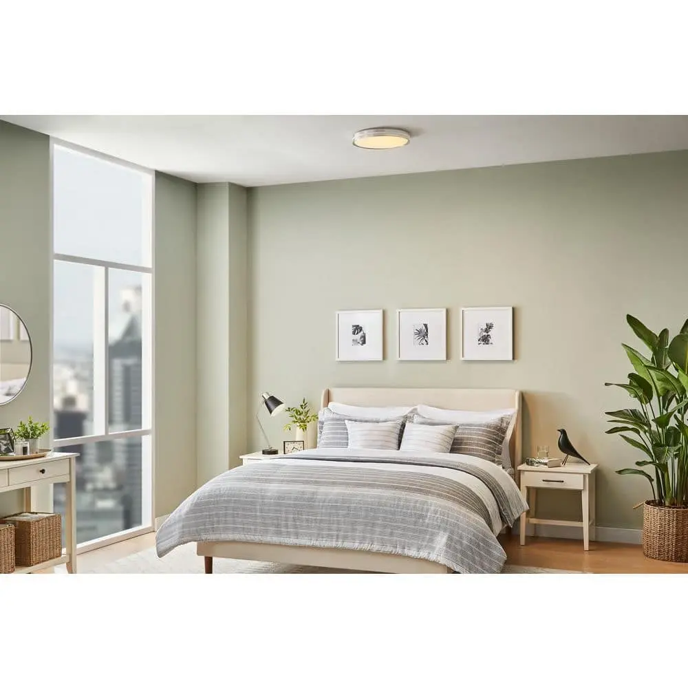 The Hampton Bay ASHBURROW 15 in. LED Flush Mount with a brushed nickel finish and night light mode is the perfect addition to any space. It features a selectable color temperature switch, allowing you to adjust the light from 2700K to 5000K (ranging from warm white to daylight), or switch to night light mode at 2200K. This dimmable fixture offers up to 50,000 hours of use and provides 1700 Lumens, which is equivalent to a 170-Watt incandescent bulb. In night light mode, it emits 100 Lumens. The smooth acrylic shade ensures even light distribution throughout the room.