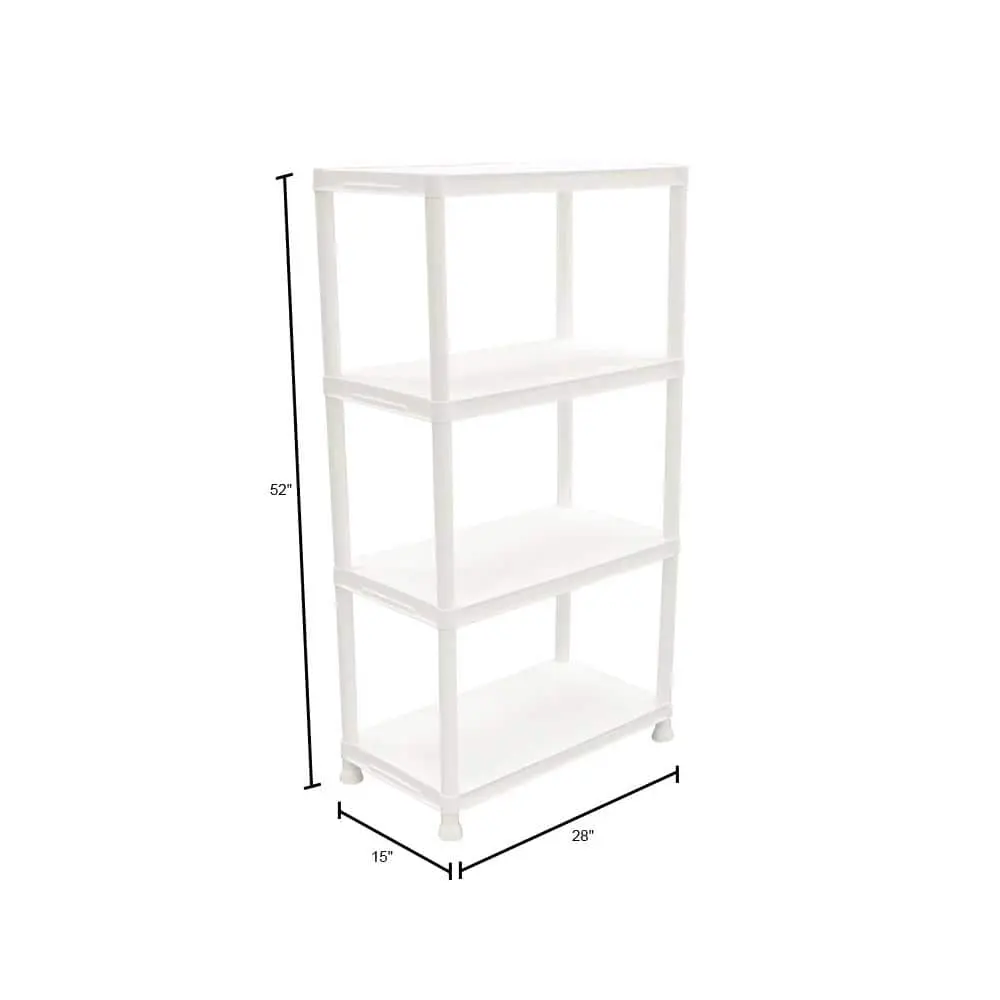 The HDX 4-Tier Easy Assembly Multi-purpose Plastic Garage Storage Shelving Unit offers a practical and durable storage solution. Made with sturdy plastic construction, it resists moisture, rust, and corrosion for long-term reliability. The unit features 4 adjustable shelves, allowing for customizable storage to fit various items. Each shelf supports up to 150 lbs, with a total capacity of 600 lbs, making it strong enough to handle heavy-duty use. Its compact size (28" W x 15" D x 52" H) is perfect for smaller spaces, and the easy assembly requires no tools, ensuring a quick setup. This shelving unit is versatile and ideal for use in garages, basements, or closets