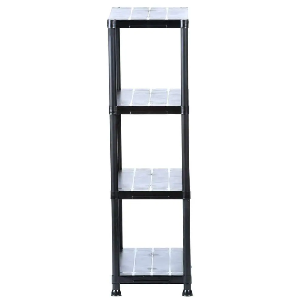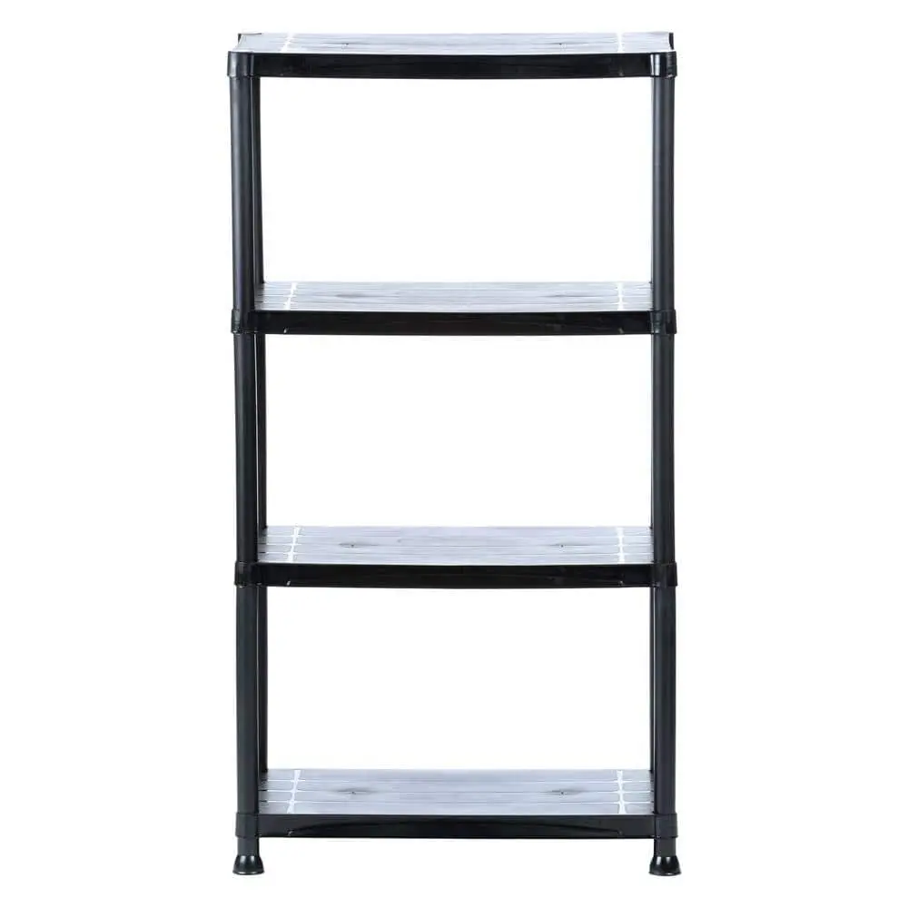 The HDX 4-Tier Easy Assembly Scratch Resistant Plastic Garage Storage Shelving Unit is designed for durability and convenience. With dimensions of 28 in. W x 52 in. H x 15 in. D, this shelving unit offers ample space for organizing your garage or utility room. Made from scratch-resistant plastic, it can handle heavy-duty use while maintaining its appearance. The unit features 4 adjustable shelves to customize your storage needs, supporting up to 50 lbs per shelf. Easy assembly requires no tools, making it quick and hassle-free to set up. Its compact design is perfect for smaller spaces while providing efficient storage