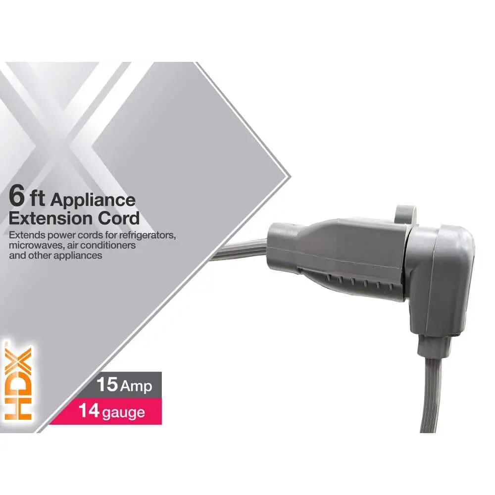 The HDX 6 ft. 15 Amp Air Conditioner/Appliance Extension Cord is designed for use with medium-duty appliances and is UL certified. It extends the power cord for use with air conditioners, refrigerators, and other appliances. The right-angle plug is molded onto the vinyl cord for added strength and helps save space in tight wall applications.