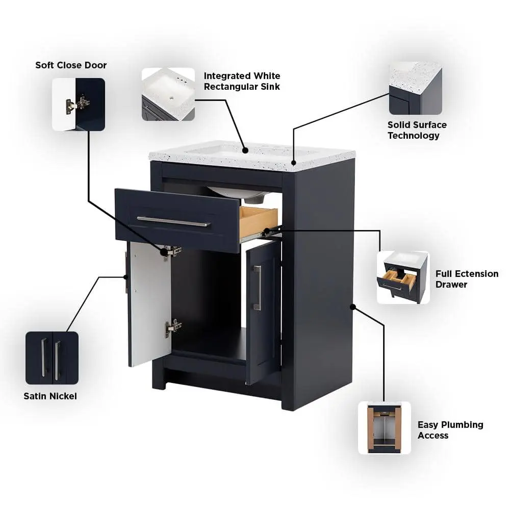 The 24.5-inch W Clady bathroom vanity in deep blue features a transitional design with inset Shaker-style doors, satin nickel hardware, and a granite-look cultured marble sink top. This freestanding vanity includes a two-door cabinet with adjustable, soft-close hinges and a below-sink drawer with three compartments for organized storage.Constructed from durable laminate furniture board, it boasts a one-piece silver ash cultured marble vanity top with an integrated rectangular white sink for a seamless appearance. The silver ash finish has a light gray base with gray, off-white, and reflective silver flecks. The single-sink top is pre-drilled for a 4-inch centerset faucet, allowing for easy style customization.Designed for quick installation around existing plumbing, this pre-assembled vanity features an open-back design, a U-shaped drawer with an adjustable front, adjustable hinges, and an unattached vanity top.