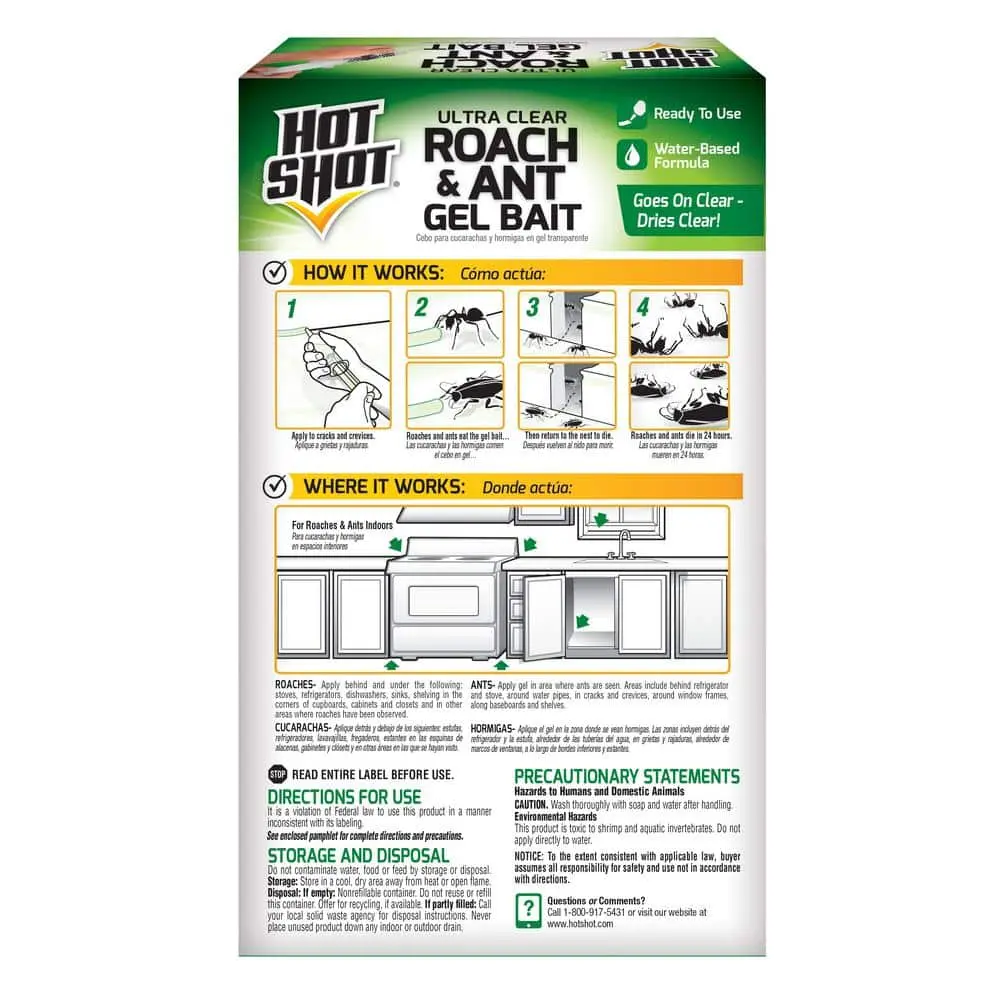 Hot Shot Ultra Clear Roach & Ant Gel Bait is an effective, ready-to-use water-based solution for controlling roaches and ants indoors. This clear gel bait works quickly, killing ants and roaches within minutes, including the queen and entire colony, as well as the eggs they carry. It dries clear and continues to work for up to three months. Simply use the included syringe to apply pea-sized droplets of the gel in cracks and crevices where pests are present. When the pests consume the gel, they return to the nest and die within 24 hours. For best results, inspect and replace the bait as needed. Please note, this product does not control carpenter, pharaoh, harvester, or red imported fire ants.