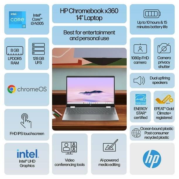 From classroom to coffee shop to couch, the HP Chromebook Plus x360 gives you the freedom and tools to do more—while staying light, secure, and sustainable.