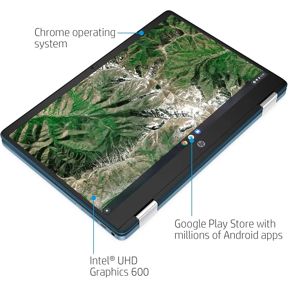 The HP Laptop x360 14a Chromebook is a versatile and portable 14-inch touchscreen laptop designed for everyday tasks and entertainment. Featuring a sleek Nocturne blue metallic design, this renewed Chromebook offers solid performance with Chrome OS, making it ideal for browsing, streaming, and cloud-based work.
