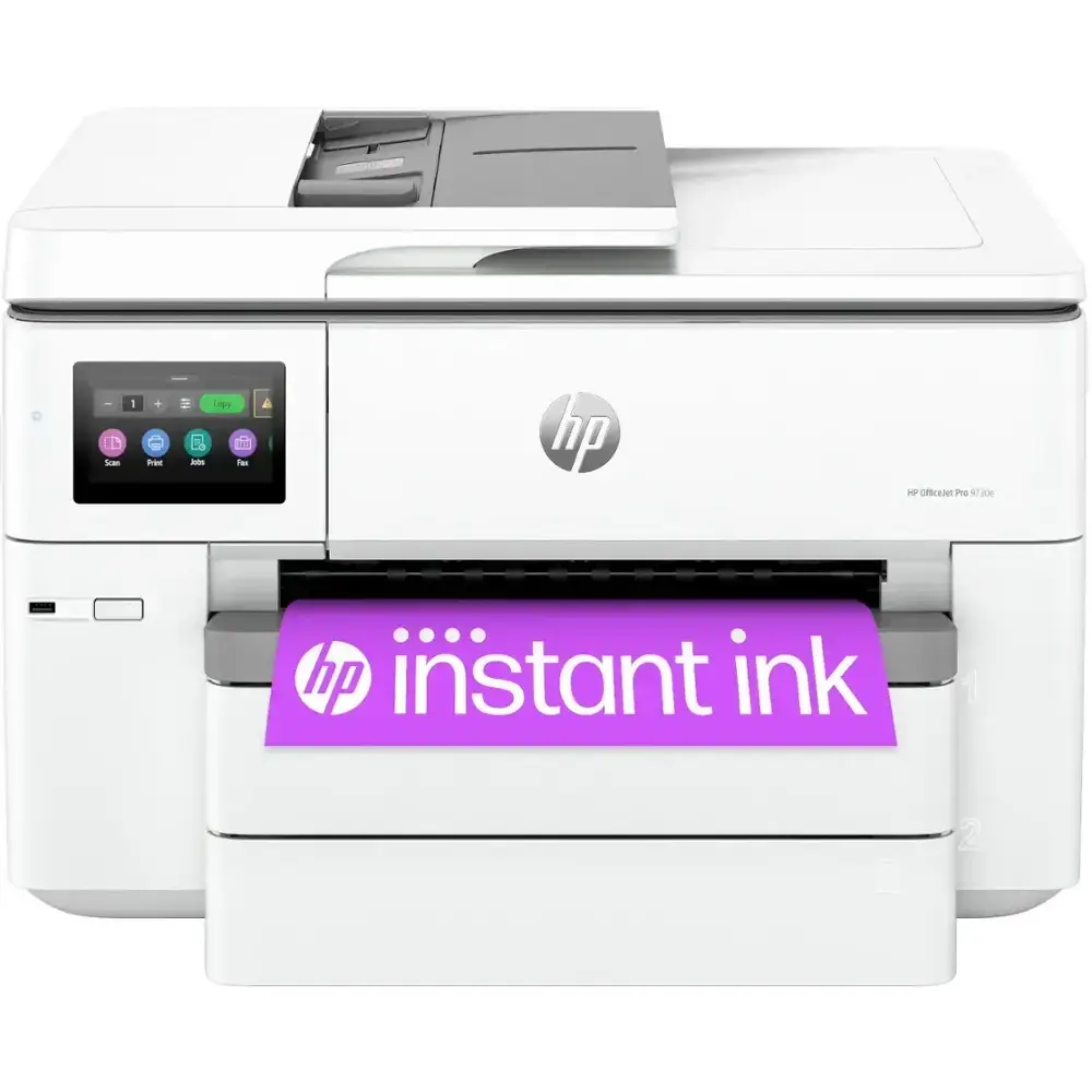 The HP OfficeJet Pro 9730e Wireless All-In-One Inkjet Printer is designed for efficient, high-quality printing with its wide format printing capability, allowing you to print up to 11" x 17". It offers wireless connectivity, making it easy to print from smartphones, tablets, and laptops without the hassle of cables. This all-in-one functionality covers print, scan, copy, and fax needs, streamlining your workflow. With the HP+ subscription, you get 3 months of Instant Ink included, ensuring you never run out of ink. Its fast print speed of up to 22 pages per minute and high-quality prints make it an ideal choice for busy professionals, while its energy-efficient design helps save on power