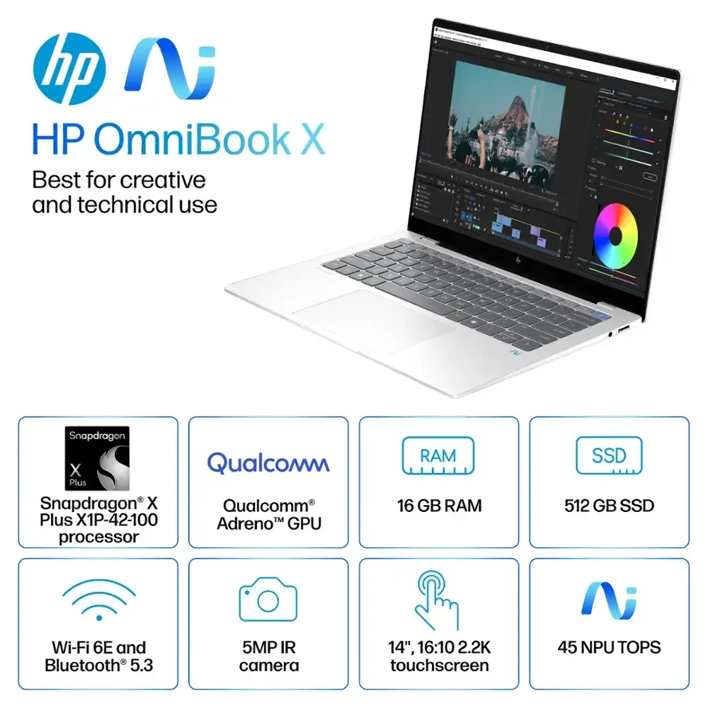 The HP OmniBook X Copilot+ PC is a powerful and sleek 14" laptop that combines performance, style, and portability. Featuring a 14" 2.2K Touchscreen Display, it delivers crisp visuals with responsive touch interaction. Powered by the Snapdragon X Plus Processor, it ensures smooth multitasking and reliable performance for everyday tasks. With 16GB LPDDR5X Memory, the laptop handles multiple applications effortlessly, while the 512GB SSD Storage provides fast access to files and quick boot times. Pre-installed with Windows 11 Home, it offers an updated and user-friendly operating system. Its Sleek Glacier Silver Design not only looks stylish but also adds durability. For versatility, it includes multiple ports, including 2x USB Type-C and a USB Type-A port. Weighing only 2.9 lbs, this lightweight laptop is perfect for users on the go, offering an excellent balance of power and portability