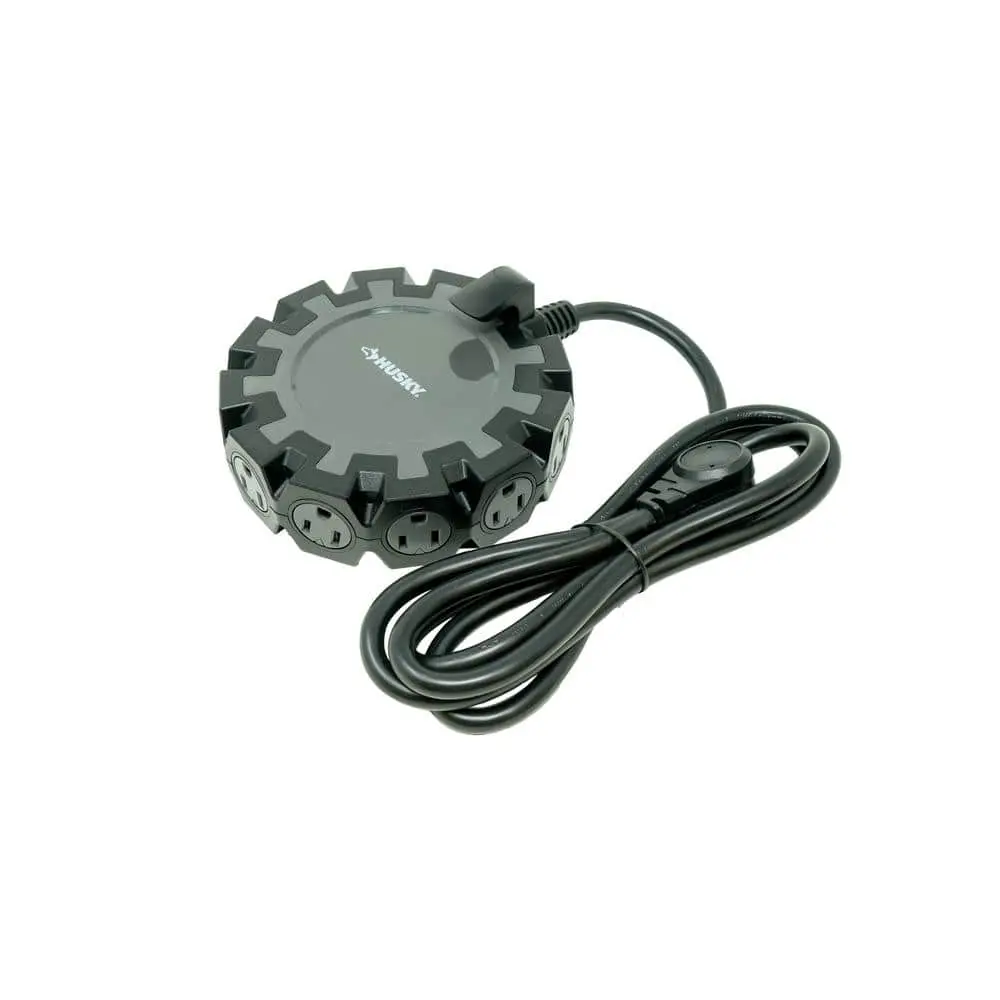 The Husky 14/3 Heavy Duty 10-Outlet Plug Adaptor Converter features 10 outlets (125-Volt/15 Amp/1875-Watt) arranged in a circular layout with extra spacing to accommodate bulky adapter plugs, making it perfect for workshops or garages. It includes mounting keyholes on the back for easy wall installation. The twist-to-close safety covers provide user-friendly protection, reducing potential electrical hazards for you and your family.