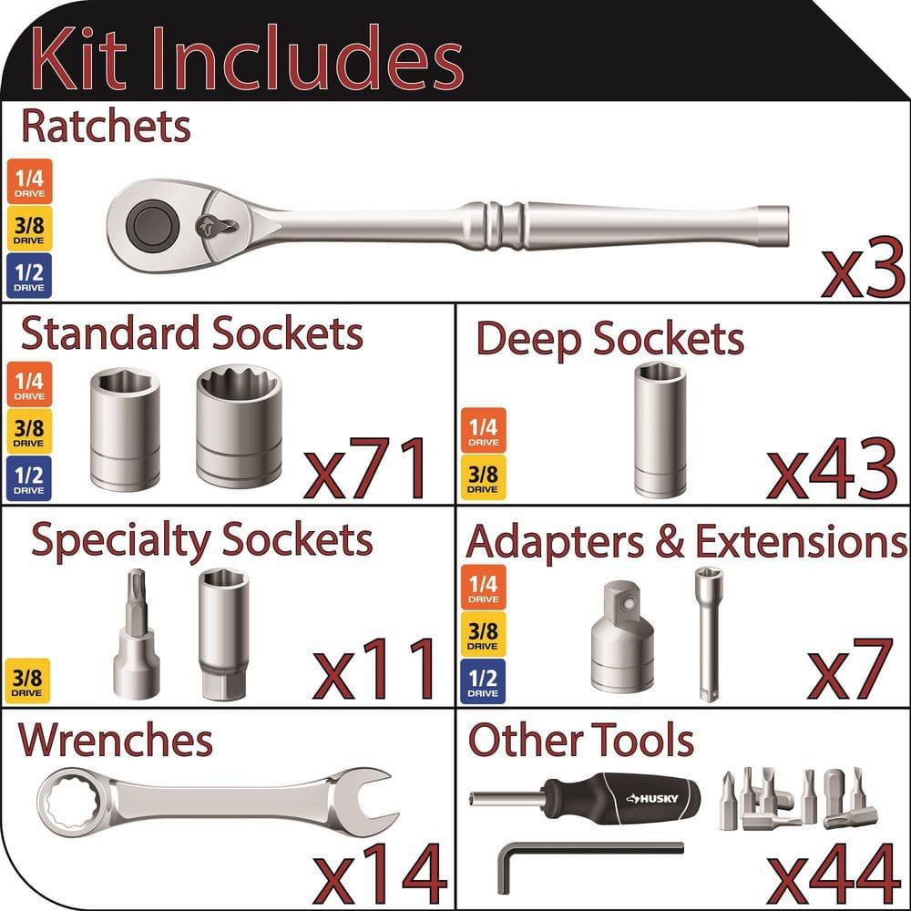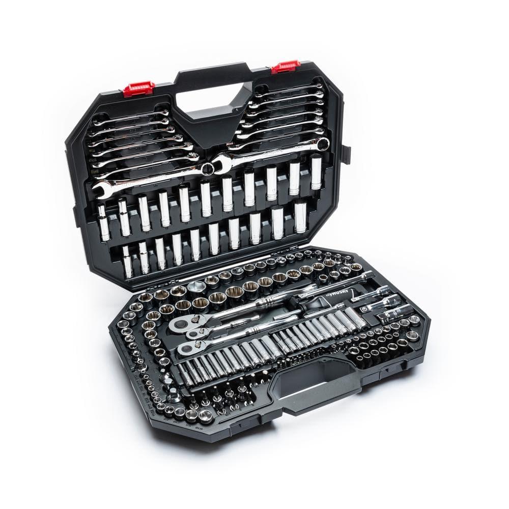 Introducing the ultimate Mechanics Tool Set from Husky a comprehensive arsenal of sockets, wrenches, and bit sockets designed to conquer any fastening task, no matter the size. Engraved with precision and built for durability, these tools are housed in a convenient plastic storage case with dedicated compartments for each of the 194 pieces. Crafted from tough Chrome Alloy steel and finished to resist corrosion, this set is ready for the toughest challenges. With 125 standard and deep sockets, as well as 14 combination wrenches, there's no project this set can't handle. Whether you're a professional or a DIY enthusiast, this portable powerhouse is the perfect companion for getting the job done right.