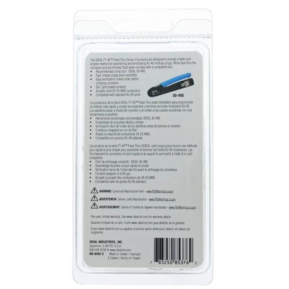The IDEAL Feed-Thru CAT6 modular plug connectors streamline cable termination by allowing conductors to pass through the end of the connector. This design ensures proper conductor order and complete wire insertion before crimping, reducing errors and saving time. The feed-thru tool crimps the connector while trimming excess conductors for a clean, precise finish.