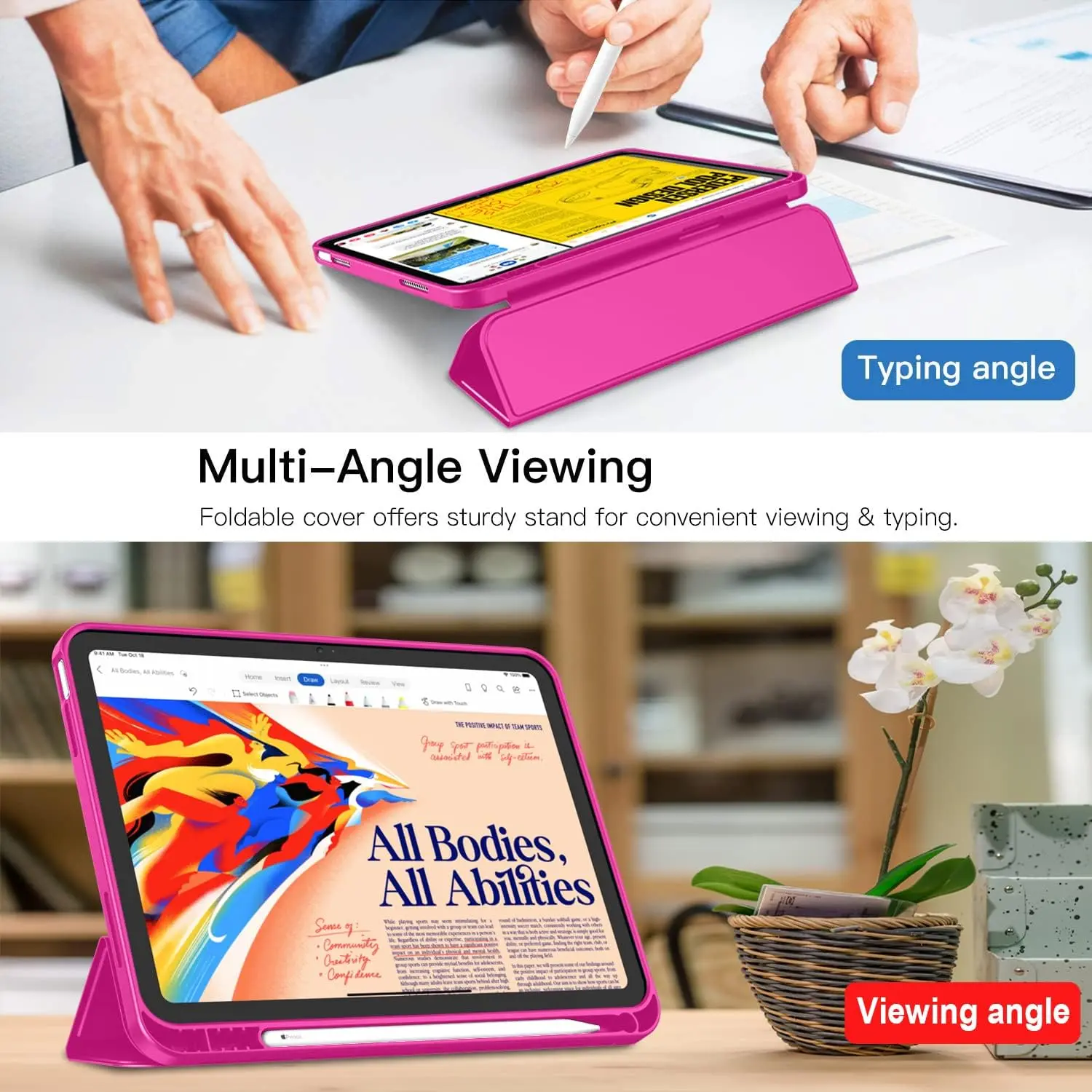 The iMieet New iPad 10.9 Inch Case (10th Gen, 2022) features a slim and lightweight design made from durable TPU material, ensuring protection from scratches and bumps. It is compatible exclusively with the iPad 10.9-inch 10th Generation (2022) model and includes a built-in Apple Pencil holder, supporting magnetic attachment and wireless charging. The case has a trifold stand for versatile viewing angles, an auto wake/sleep function, and precise cutouts for easy access to ports and features. Not compatible with other iPad models.