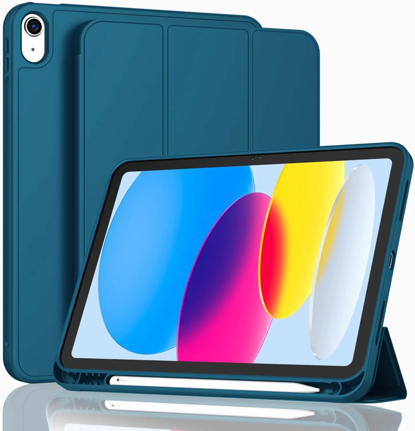 The iMieet New iPad 10.9 Inch Case (10th Gen, 2022) features a slim and lightweight design made from durable TPU material, ensuring protection from scratches and bumps. It is compatible exclusively with the iPad 10.9-inch 10th Generation (2022) model and includes a built-in Apple Pencil holder, supporting magnetic attachment and wireless charging. The case has a trifold stand for versatile viewing angles, an auto wake/sleep function, and precise cutouts for easy access to ports and features. Not compatible with other iPad models.