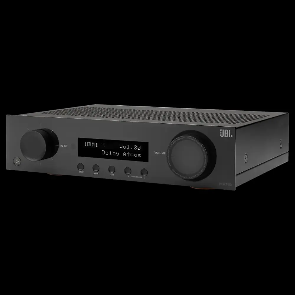 The JBL MA710 7.2-Channel AV Receiver delivers impressive audio performance with 90W per channel, creating a powerful, immersive sound experience. Equipped with Bluetooth and Wi-Fi capability, it allows seamless streaming from various devices. Enjoy Dolby Atmos support for rich, 3D surround sound paired with 8K Ultra HD compatibility for crystal-clear visuals. With HDR support, experience enhanced brightness, contrast, and color for vivid viewing. Its sleek black design adds a modern touch to any home theater setup