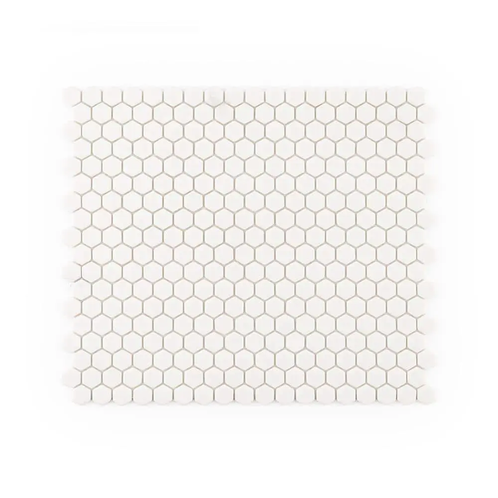 The Jeffrey Court 5/8" Muze Hexagon White 9.875 in. x 11.375 in. Hexagon Matte Glass Wall and Floor Mosaic Tile features a sleek hexagon mosaic design that adds a modern touch to any space. Its matte glass finish enhances elegance while providing a soft, sophisticated look. Designed for both wall and floor applications, this tile is water-resistant and easy to clean, making it an excellent choice for kitchens, bathrooms, and other moisture-prone areas. The mesh-mounted backing ensures quick and hassle-free installation, making it ideal for residential and light commercial use