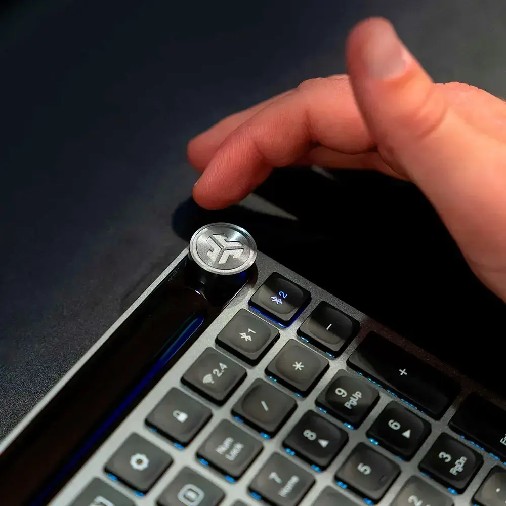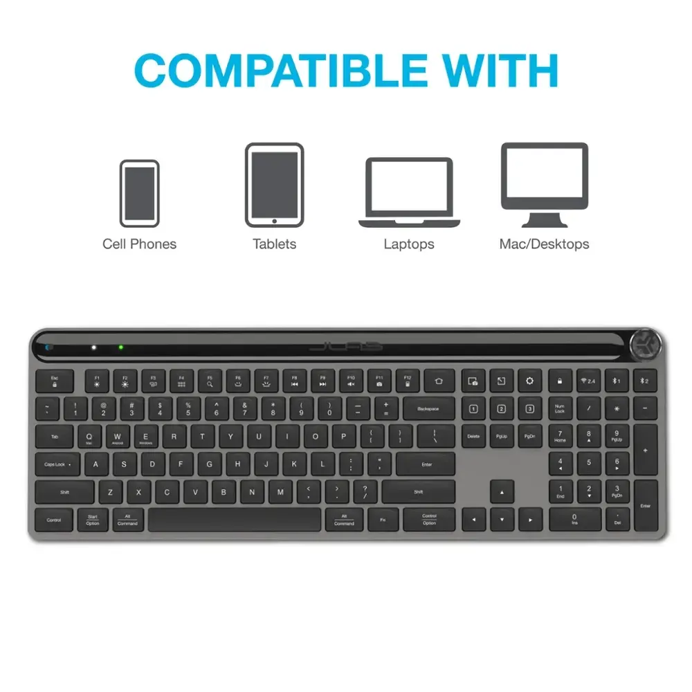 The JLab Epic Wireless Keyboard - Black offers a versatile typing experience with multi-device connection, allowing you to seamlessly switch between up to three devices via Bluetooth or a USB dongle. It features a rechargeable battery with convenient USB-C charging, ensuring long-lasting use without constant replacements. Designed for comfort, the quiet, low-profile keys provide a smooth and silent typing experience. Its compact, slim design makes it perfect for saving space on your desk, while customizable shortcuts enhance productivity. Plus, with adjustable tilt angles and compatibility with Windows, MacOS, ChromeOS, iOS, and Android, it’s a flexible solution for any setup